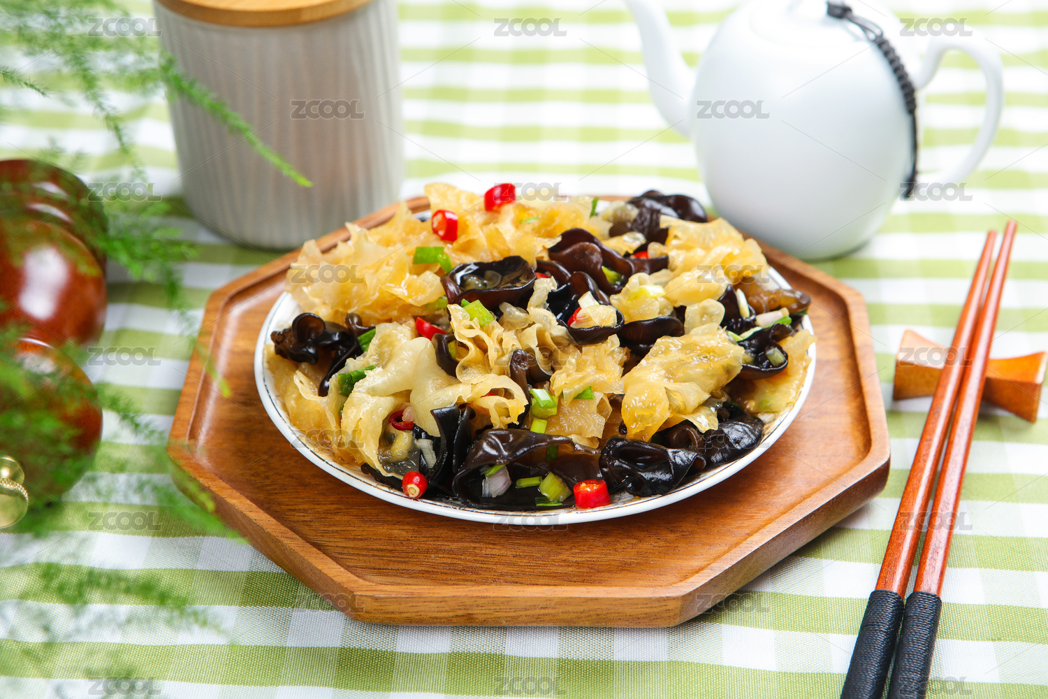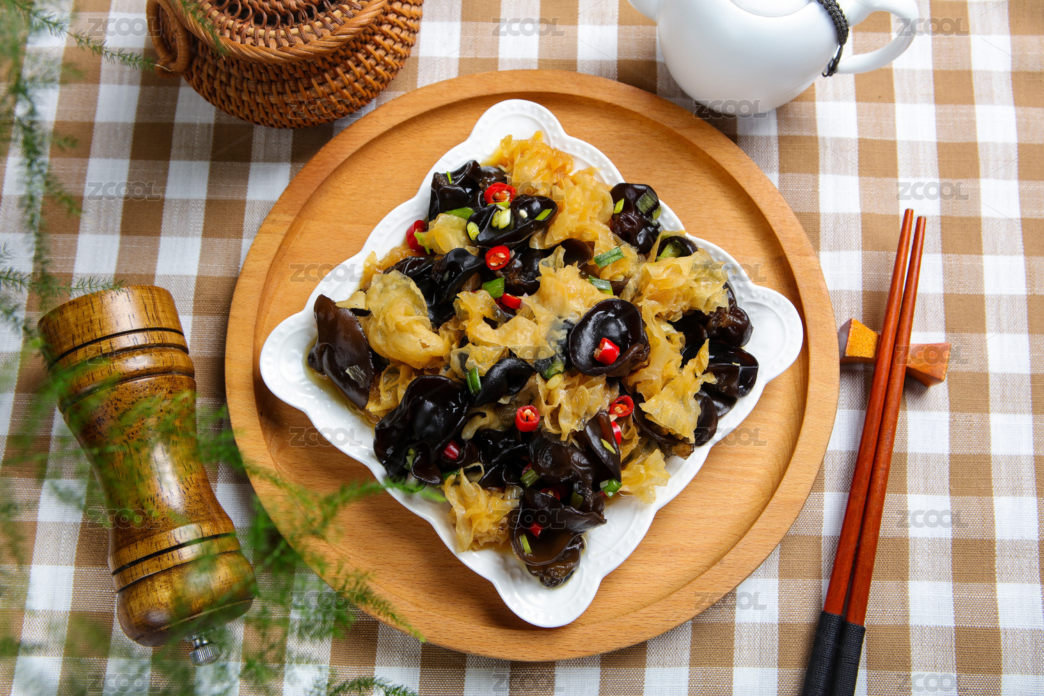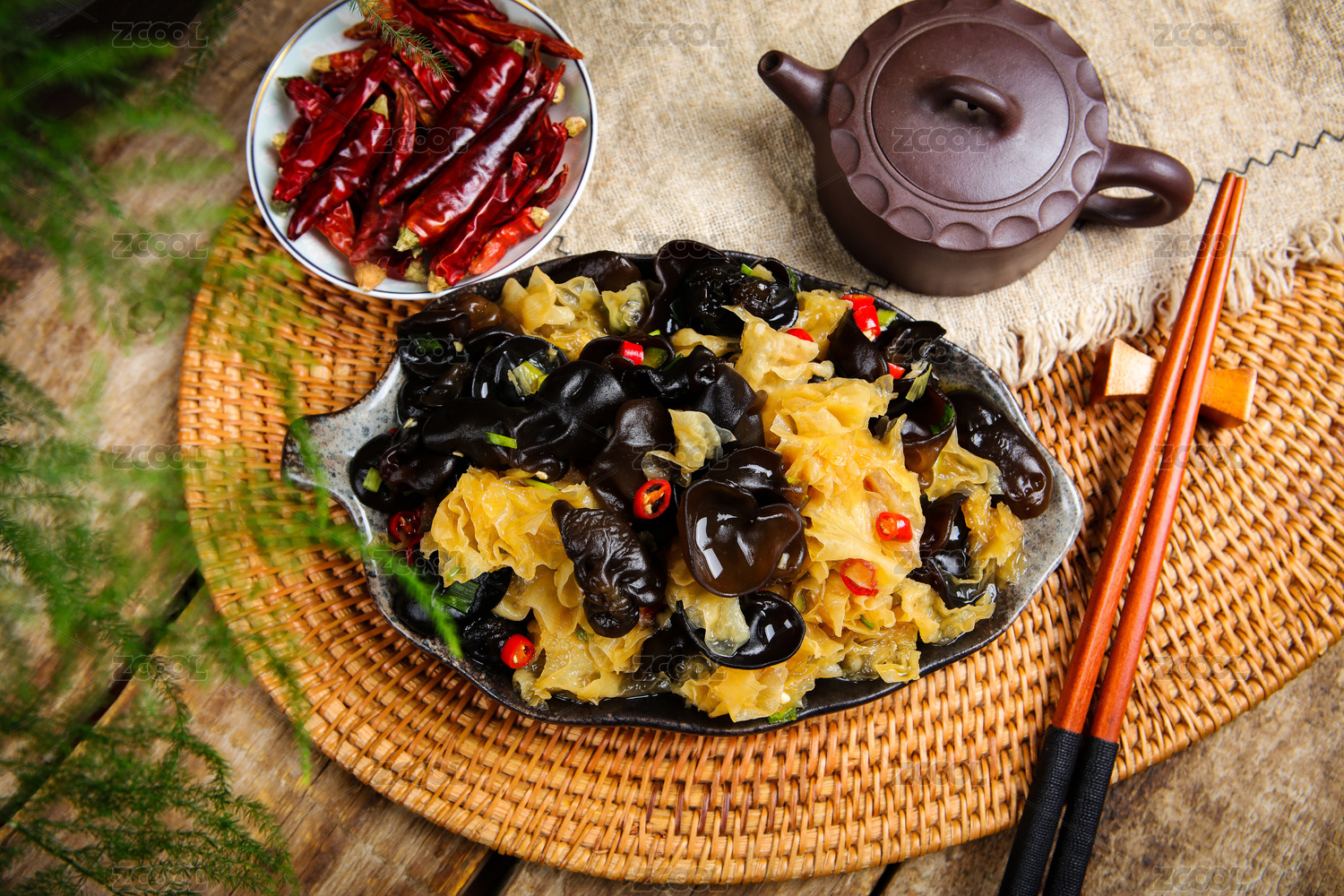 玻璃盘里的麻辣味泡椒味野山椒炒银耳