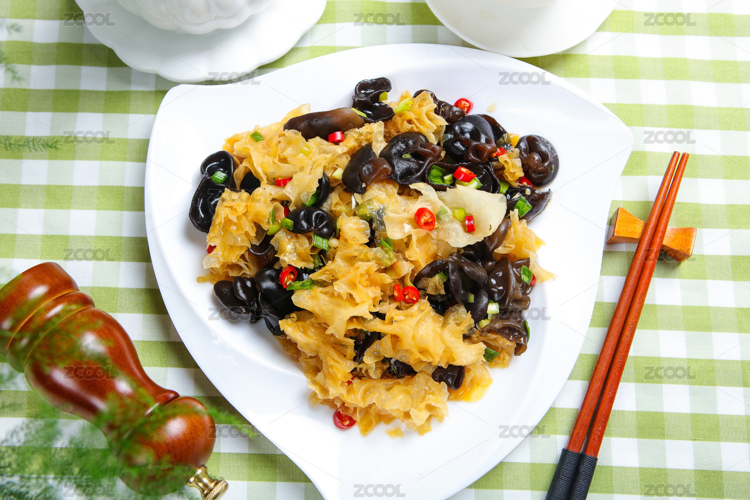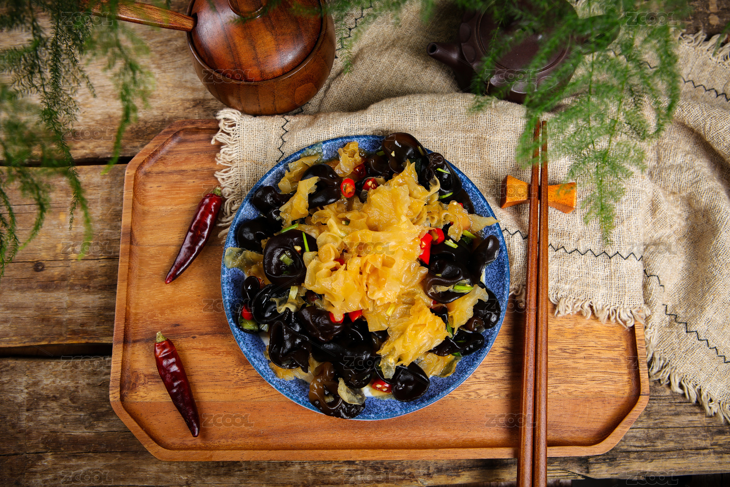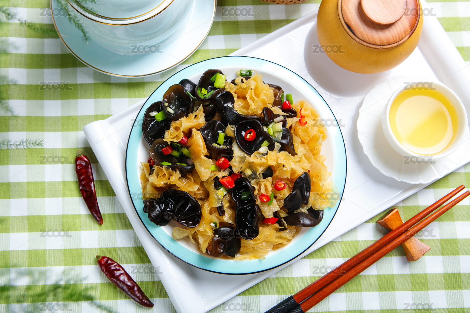 玻璃盘里的麻辣味泡椒味野山椒炒银耳
