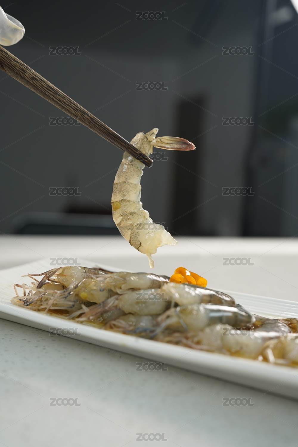 白色盘子海鲜生腌黄辣椒白虾