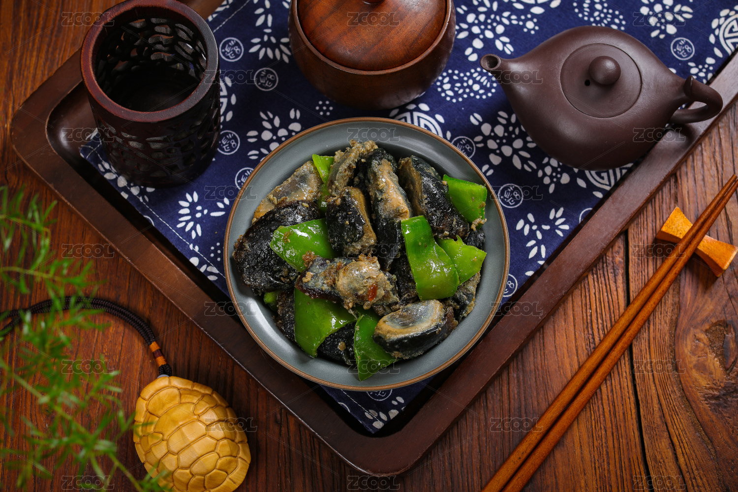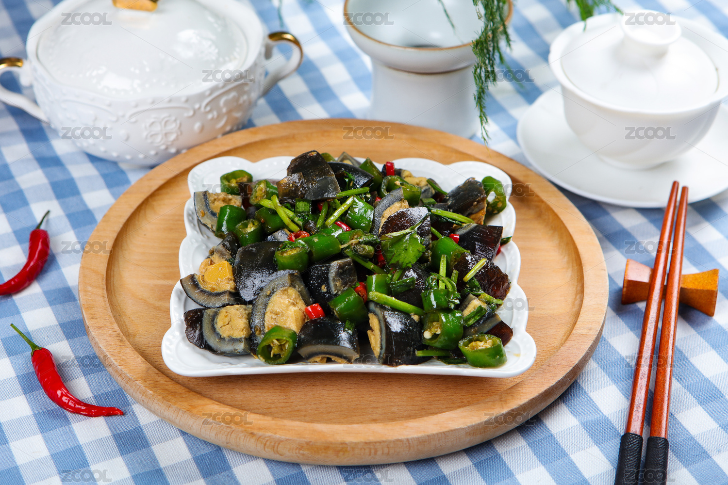 从一盘青椒皮蛋菜里夹起一块皮蛋