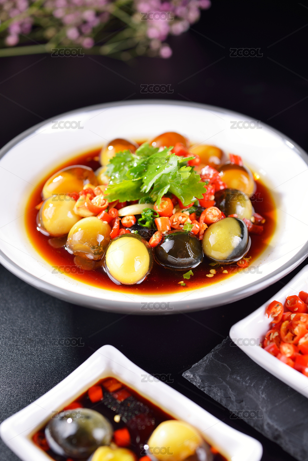 白盘子里的凉拌菜青椒圈和红椒圈拌皮蛋鹌鹑蛋
