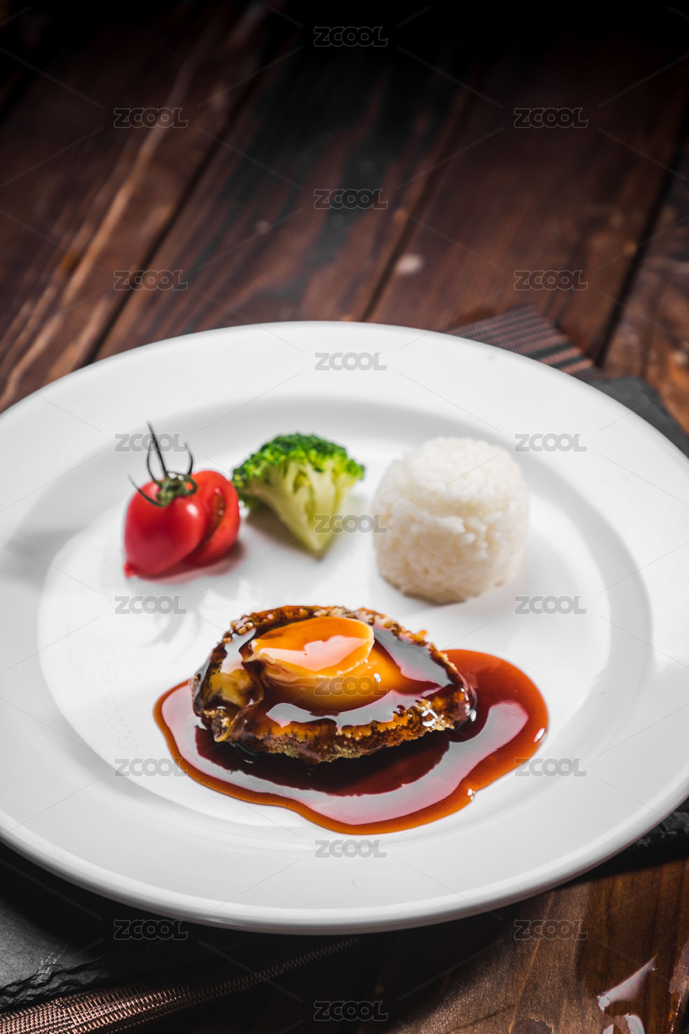 棕色木纹桌上放着一盘鲜鲍扣饭