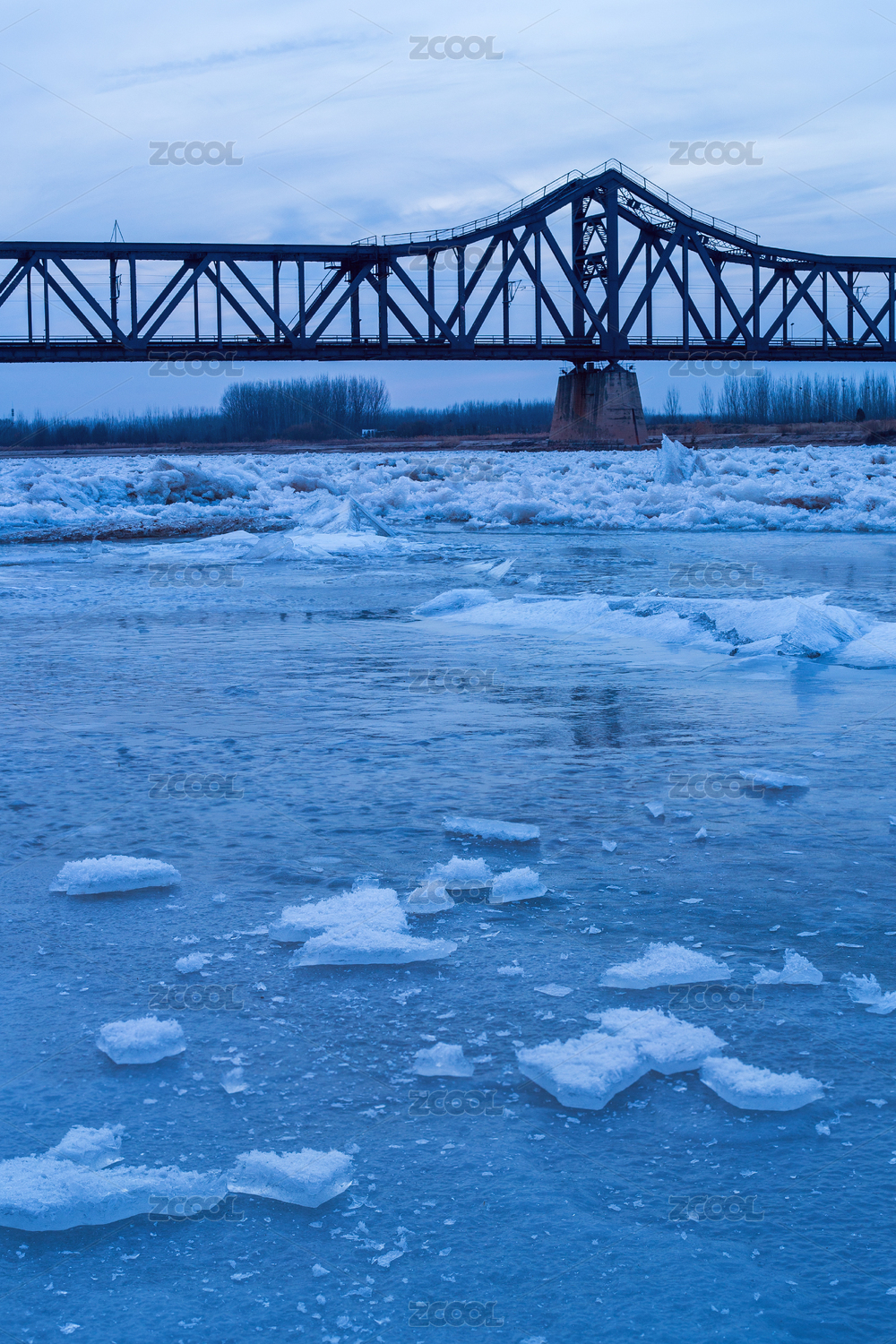 山东济南洛口黄河铁路大桥冬季冰封风光