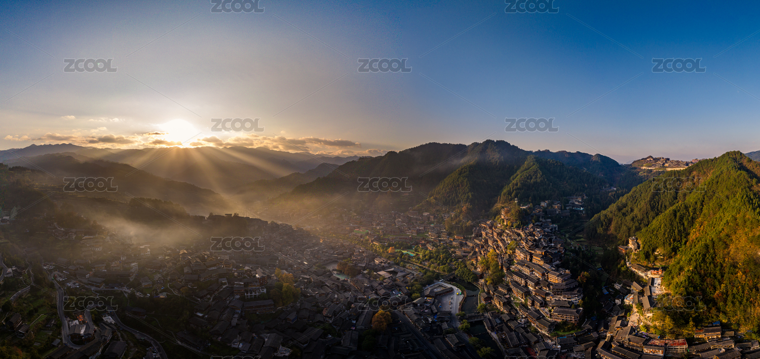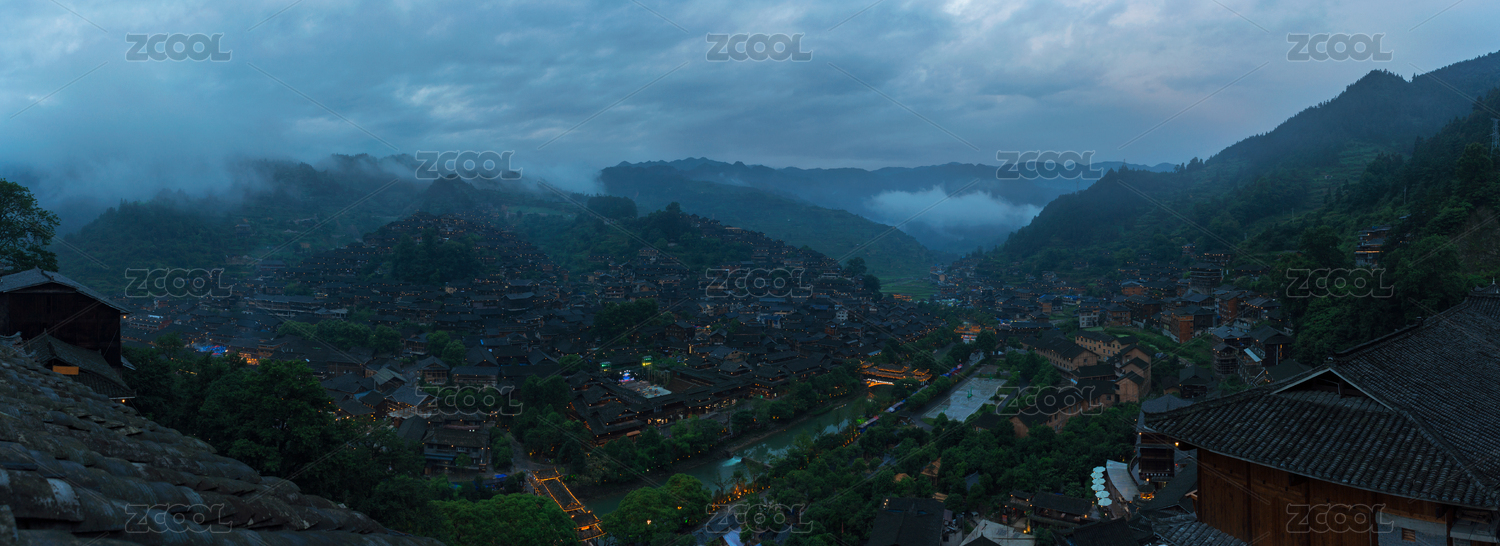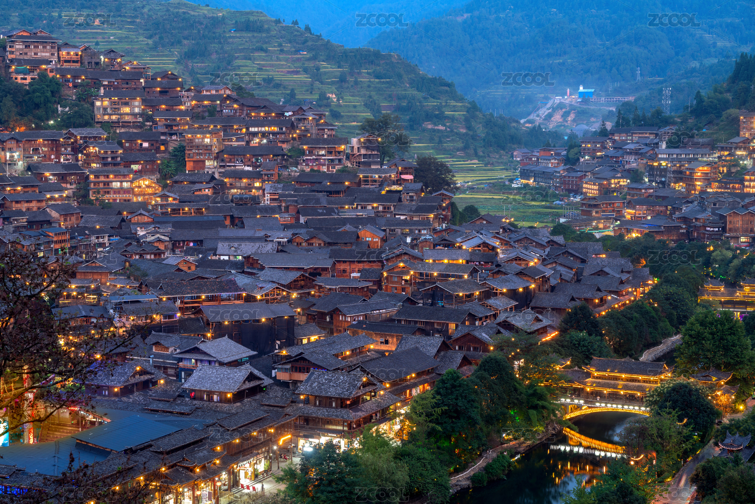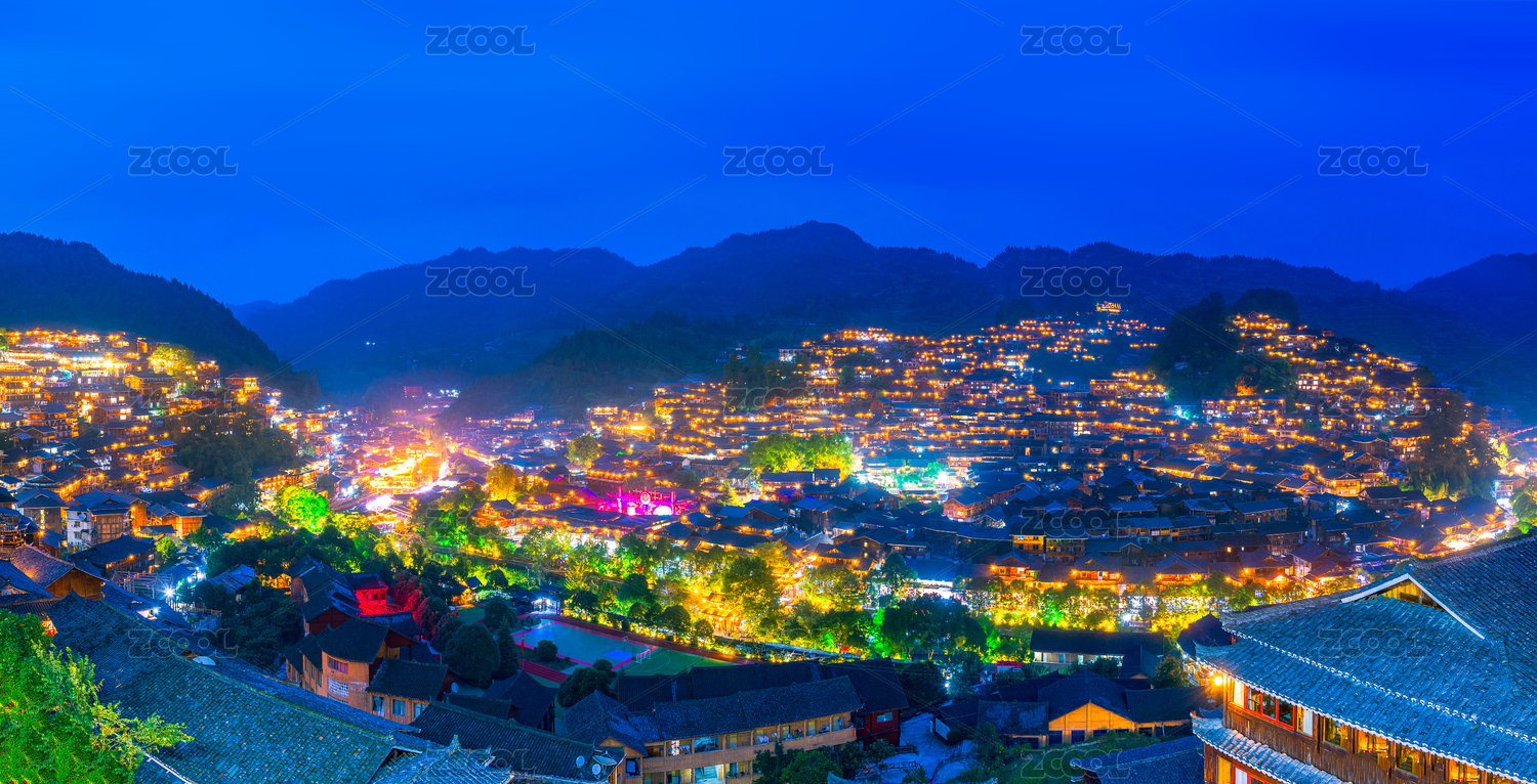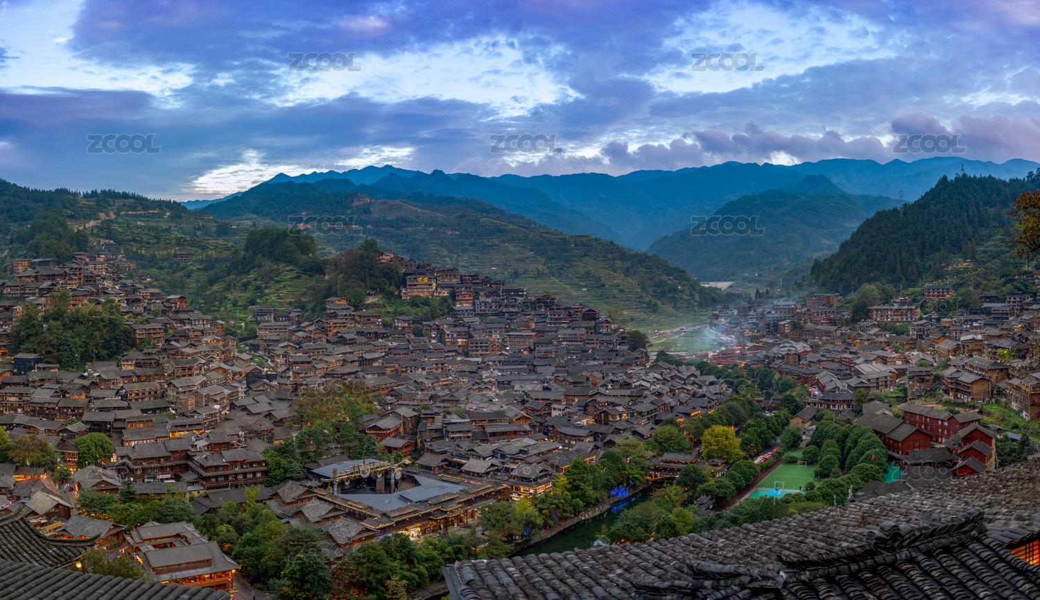 中国贵州千户苗寨宽画幅蓝调大全景图