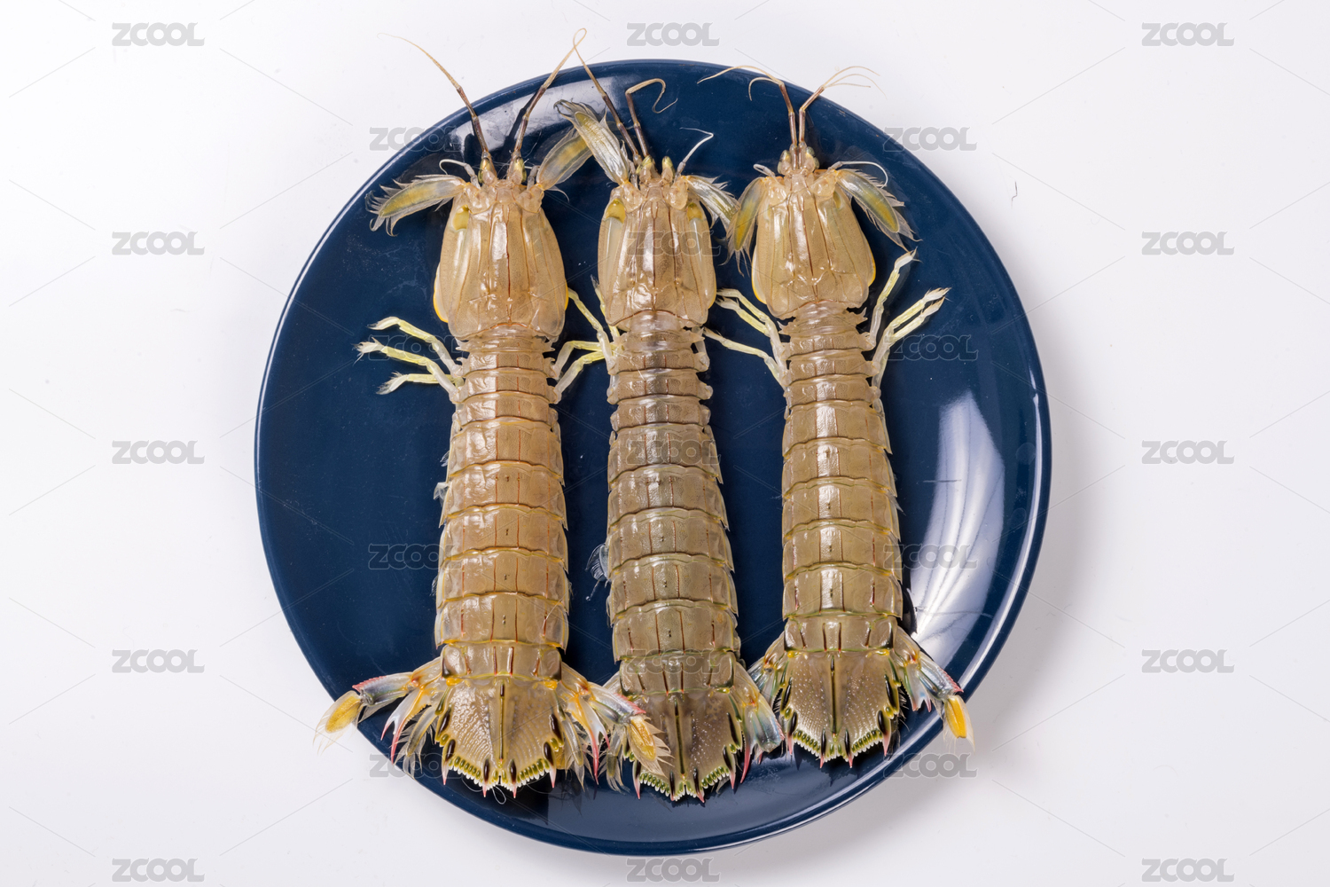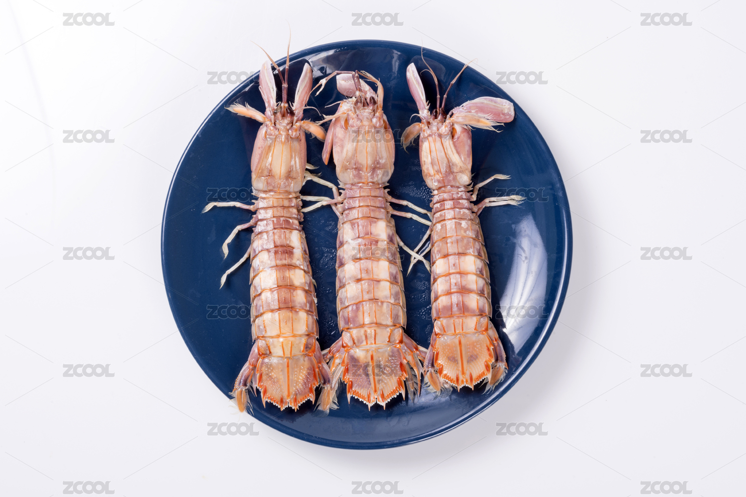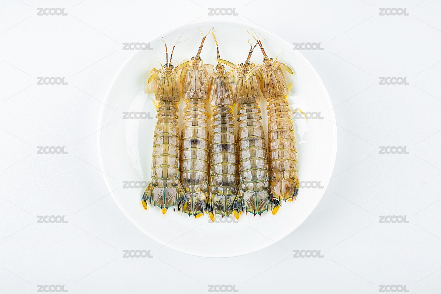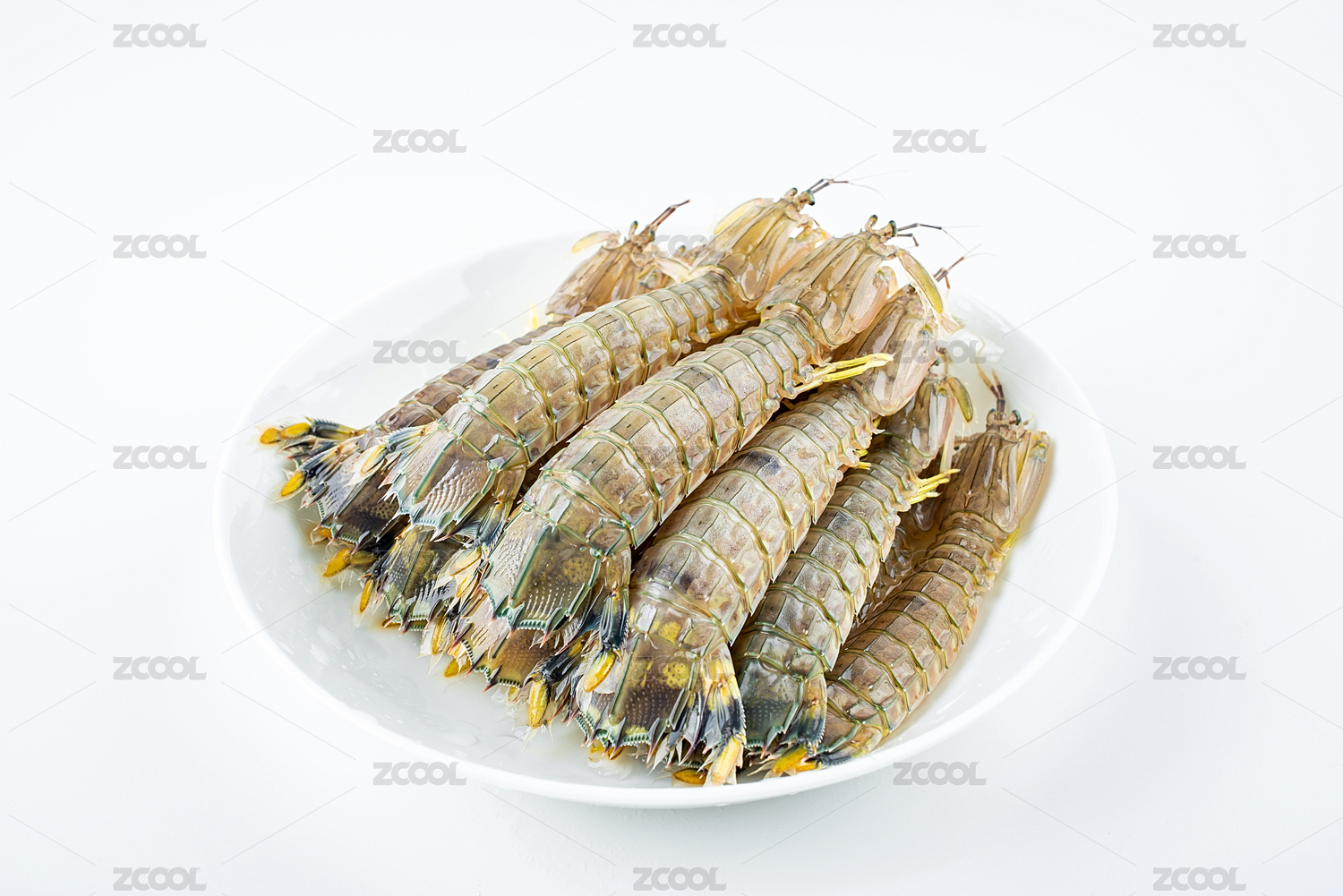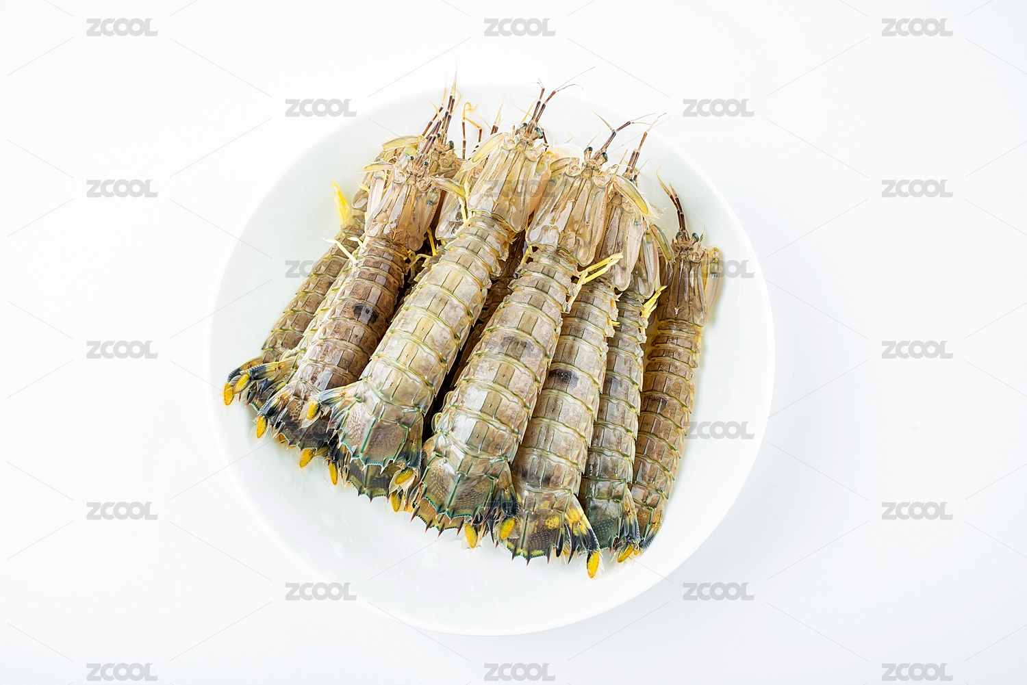 白背景上一碟新鲜的皮皮虾