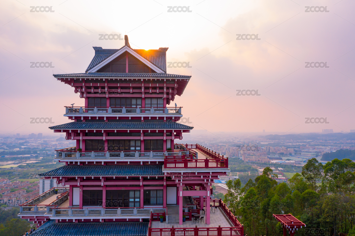 佛山南海里水展旗峰生态公园展旗楼晚霞航拍