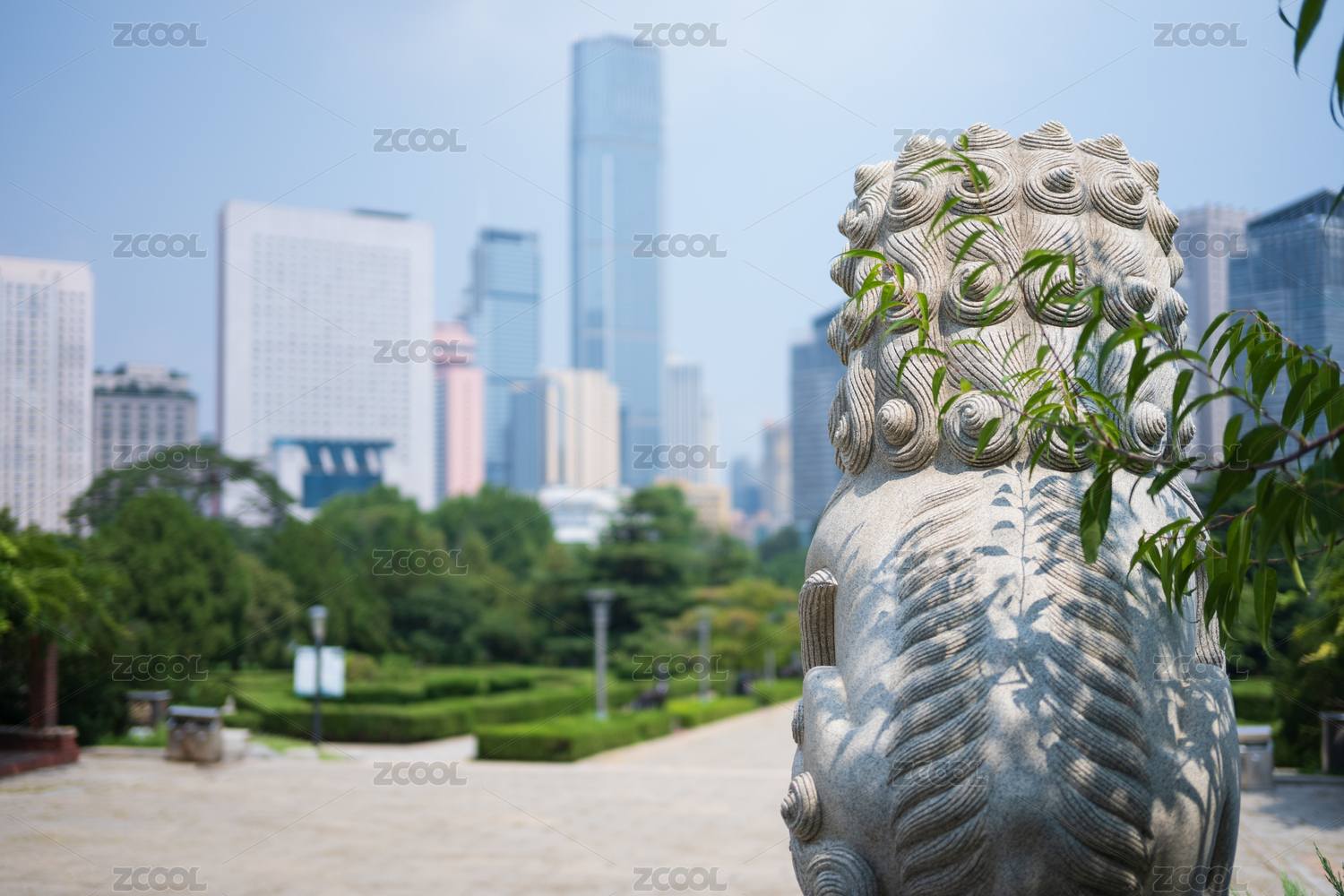 传统石狮子面对现代摩天大楼
