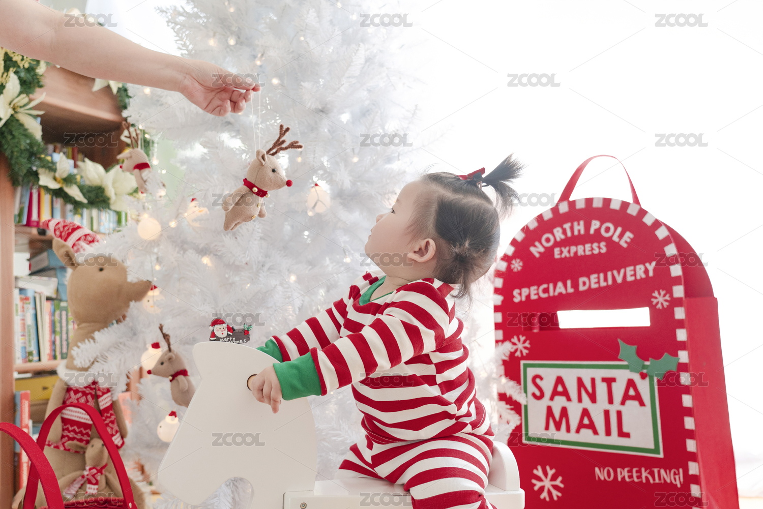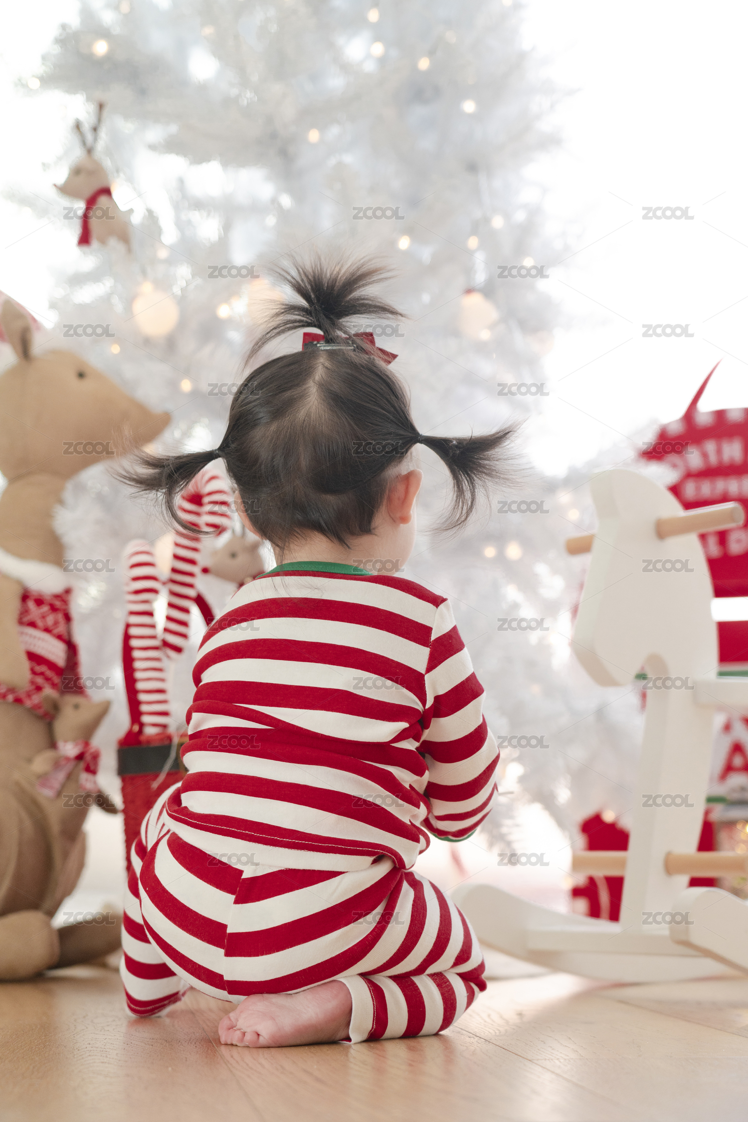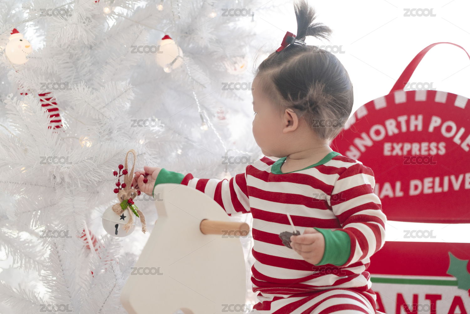 骑白木马的圣诞小女孩在装饰白色圣诞树