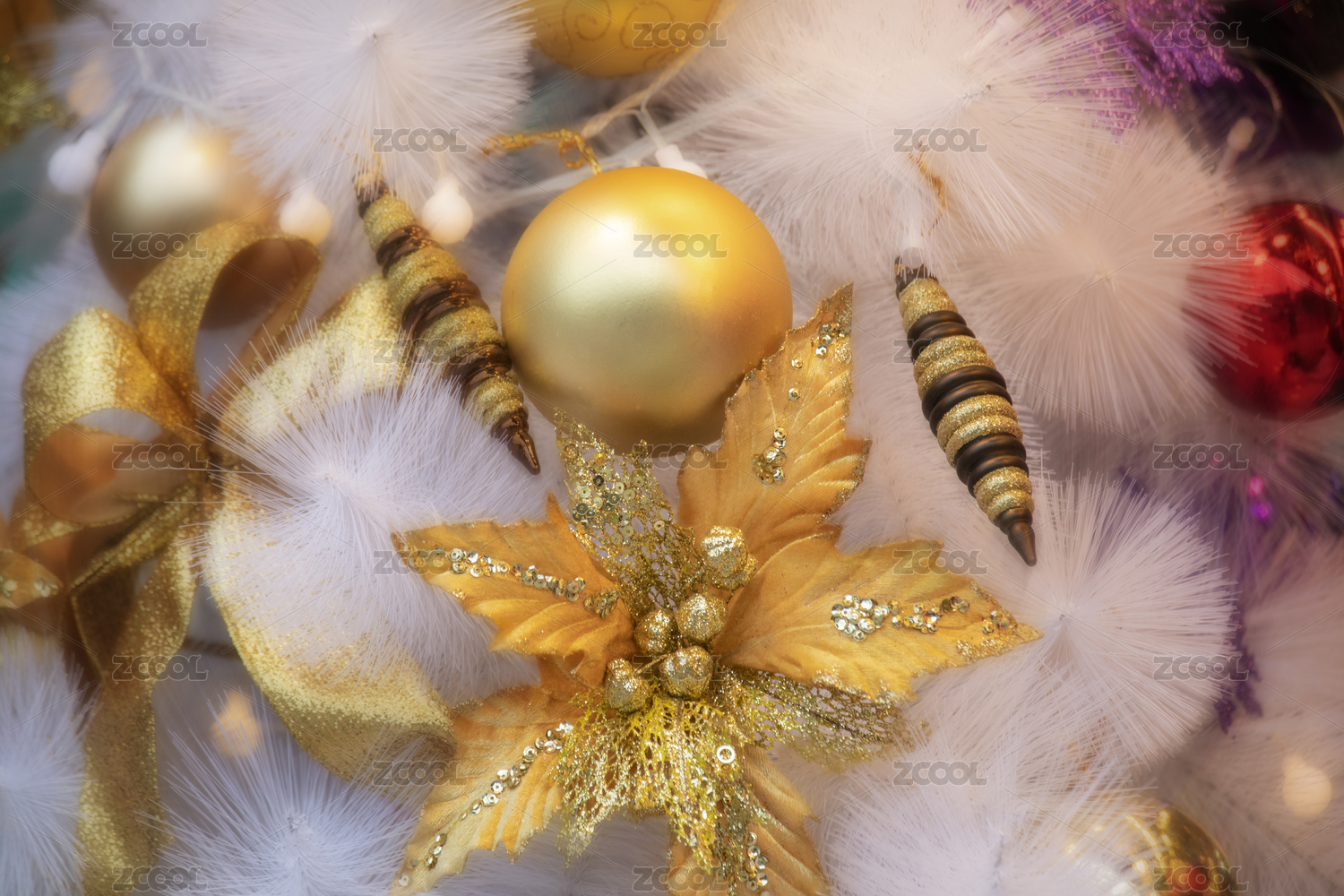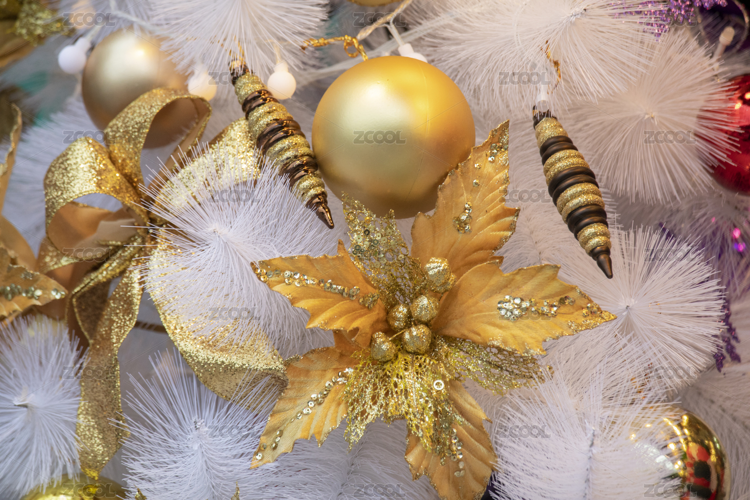 华丽的白色圣诞树上装饰着闪亮的圣诞饰品