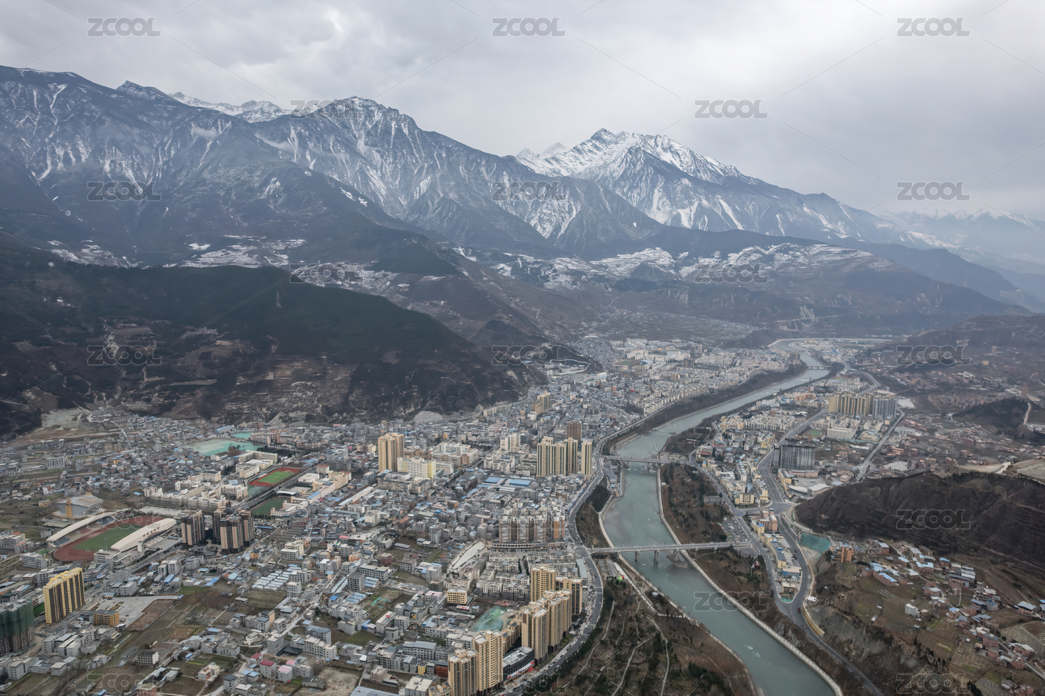 四川雅安理县雪山下的高原城市航拍