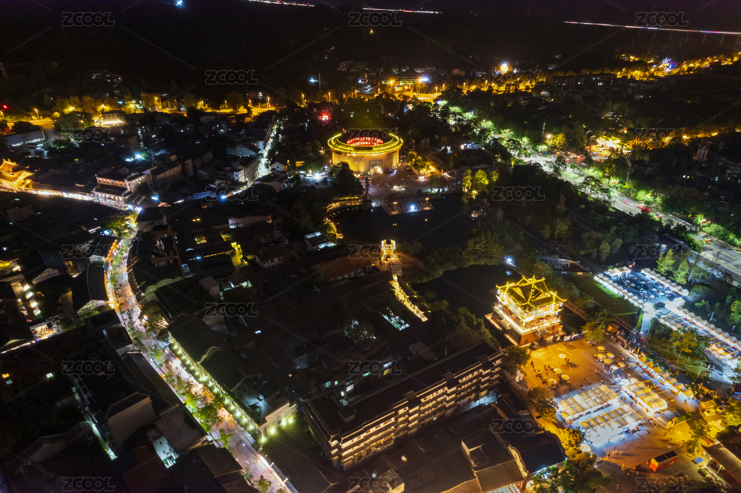 成都龙泉驿洛带古镇博客楼和五凤楼夜景航拍