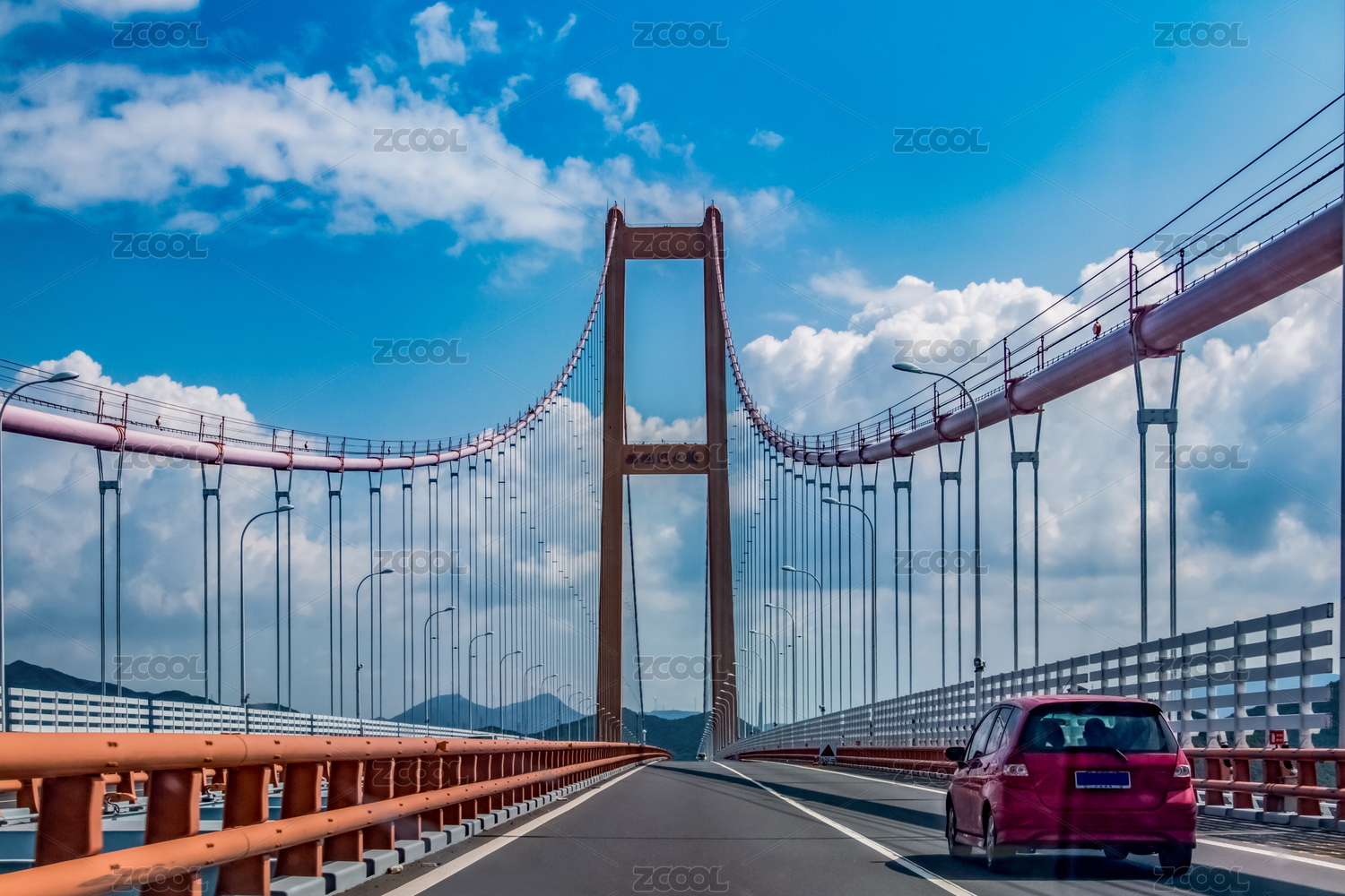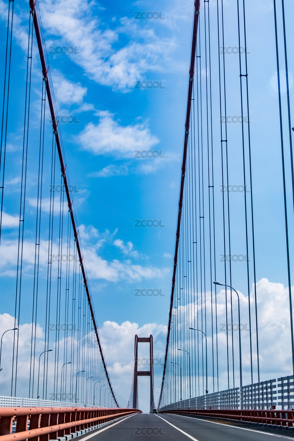 在晴朗的盛夏中,蓝天白云下壮观的浙江舟山西堠门跨海大桥