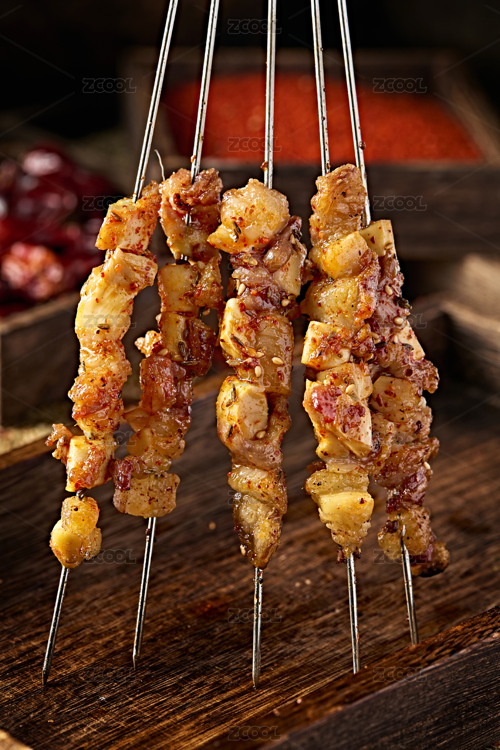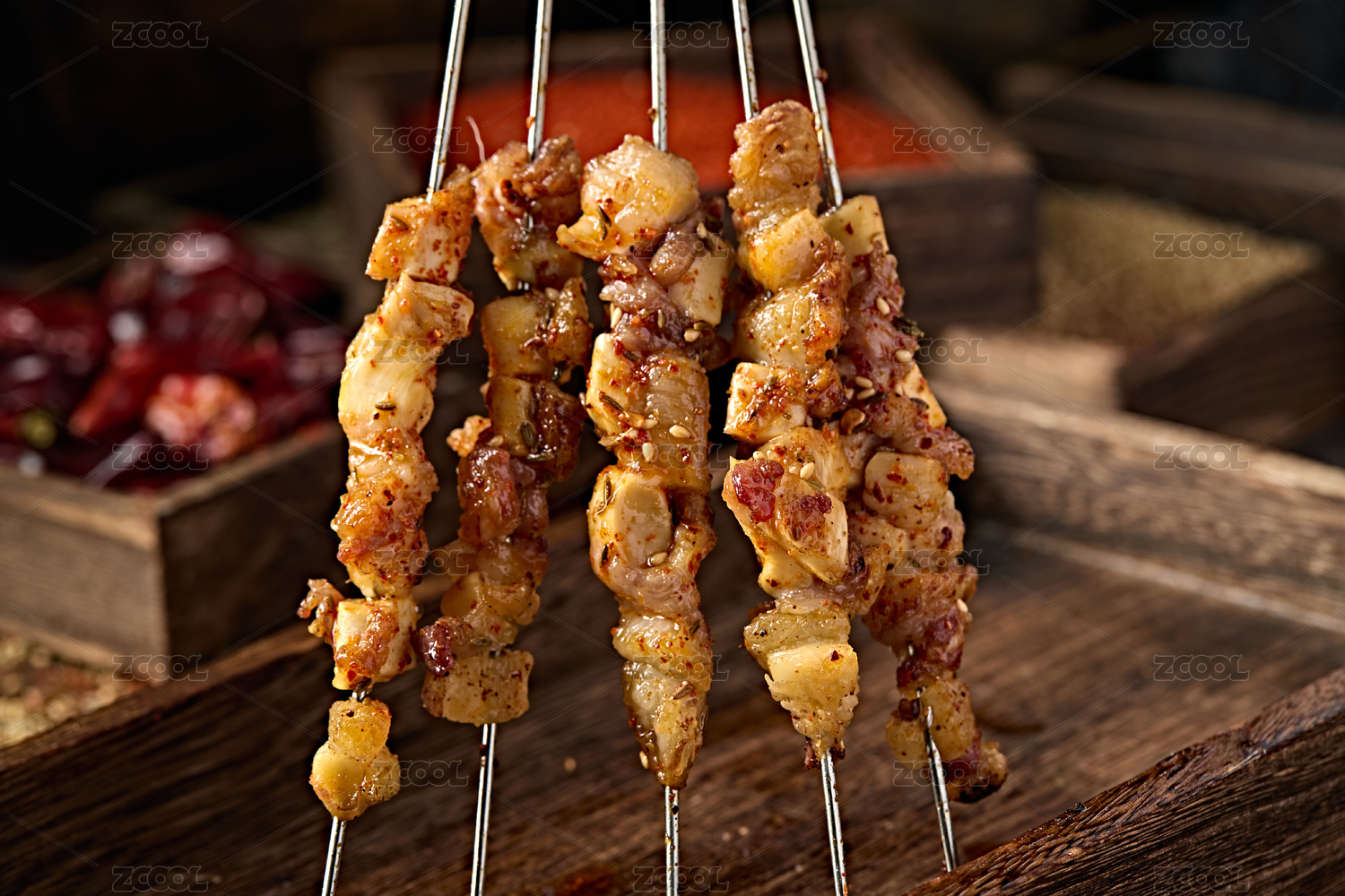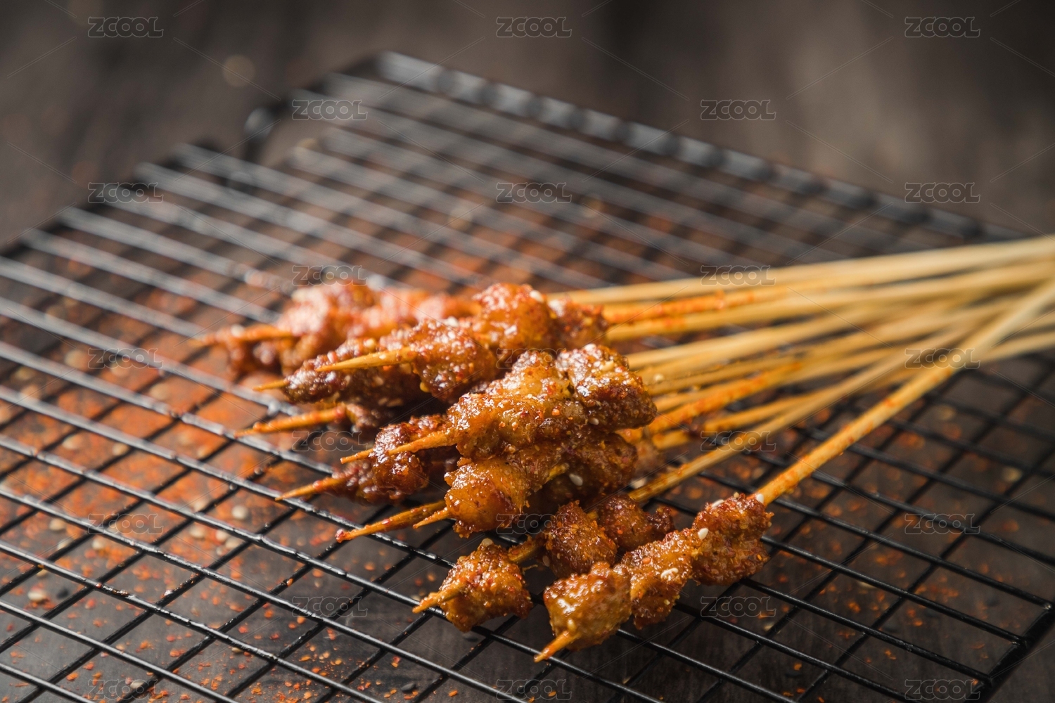 黑色烤架上放着几串撒着辣椒面的油炸肉筋