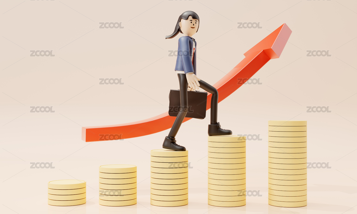 走在上升金币的3D卡通商务女性人物