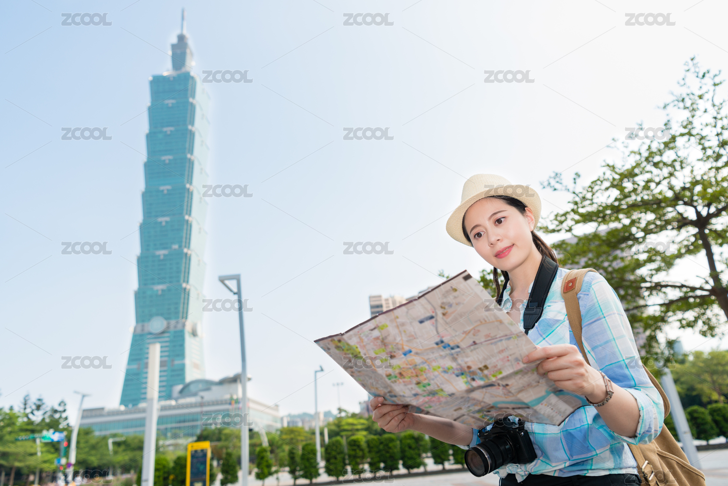 聪明的亚洲女孩的旅行者查找地图,纸质地图,发现她在这个繁忙的忙乱台北最高建筑的现代城市道路。她打算利用这个美丽的城市场景更加绚丽的照片。