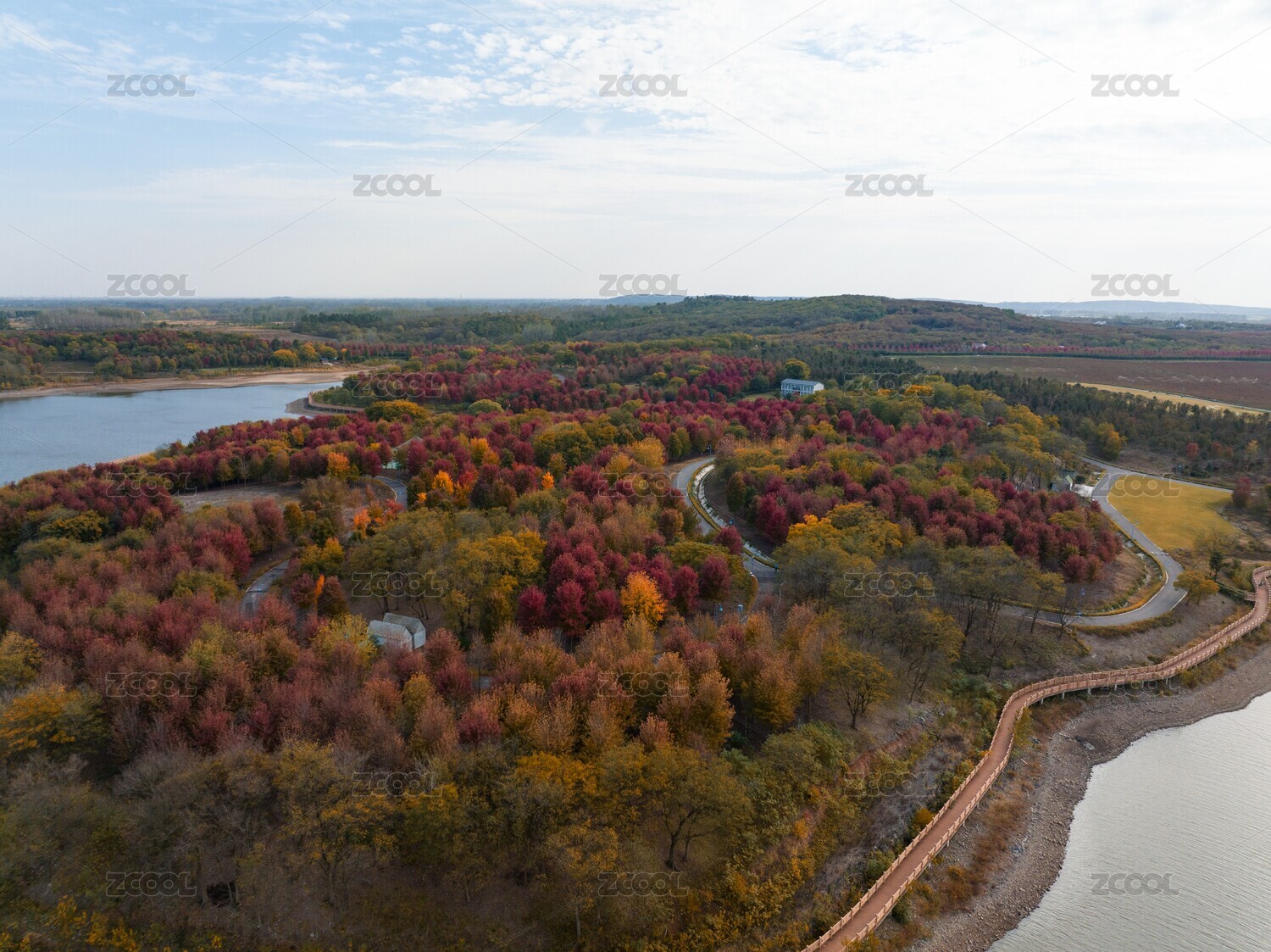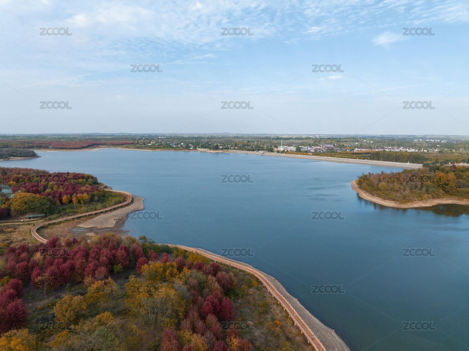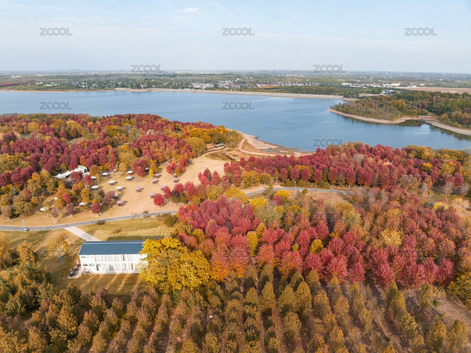 南京大泉水库旁秋季的彩色树林全景