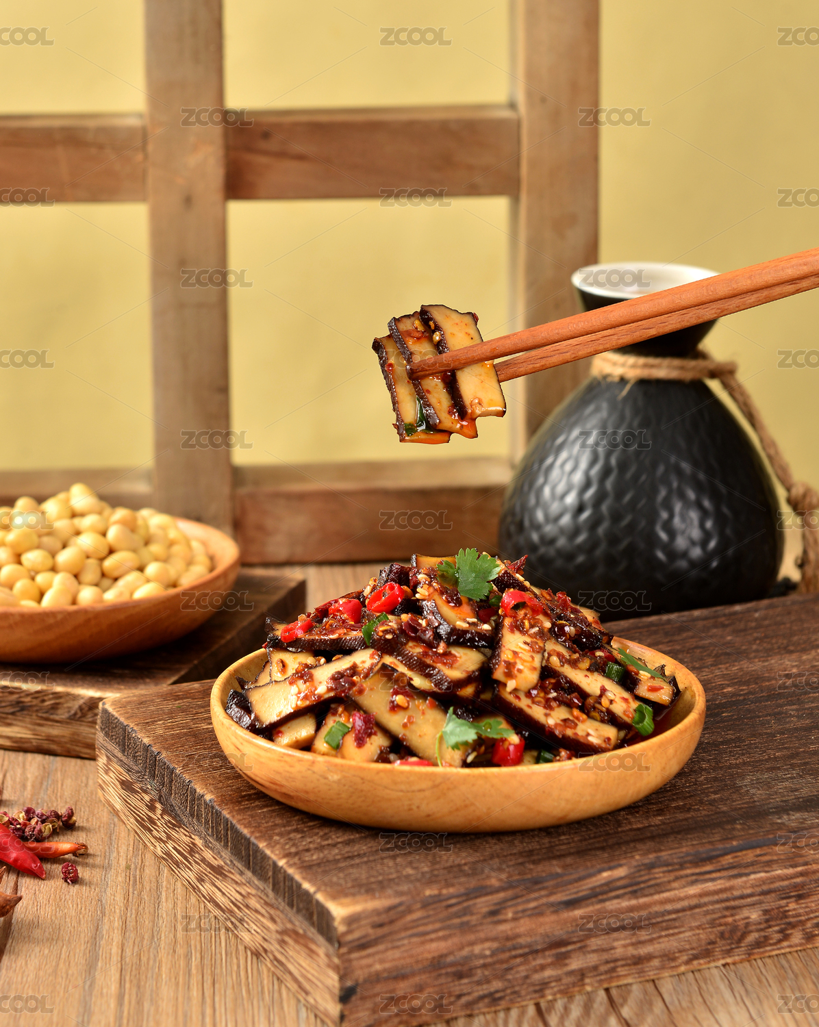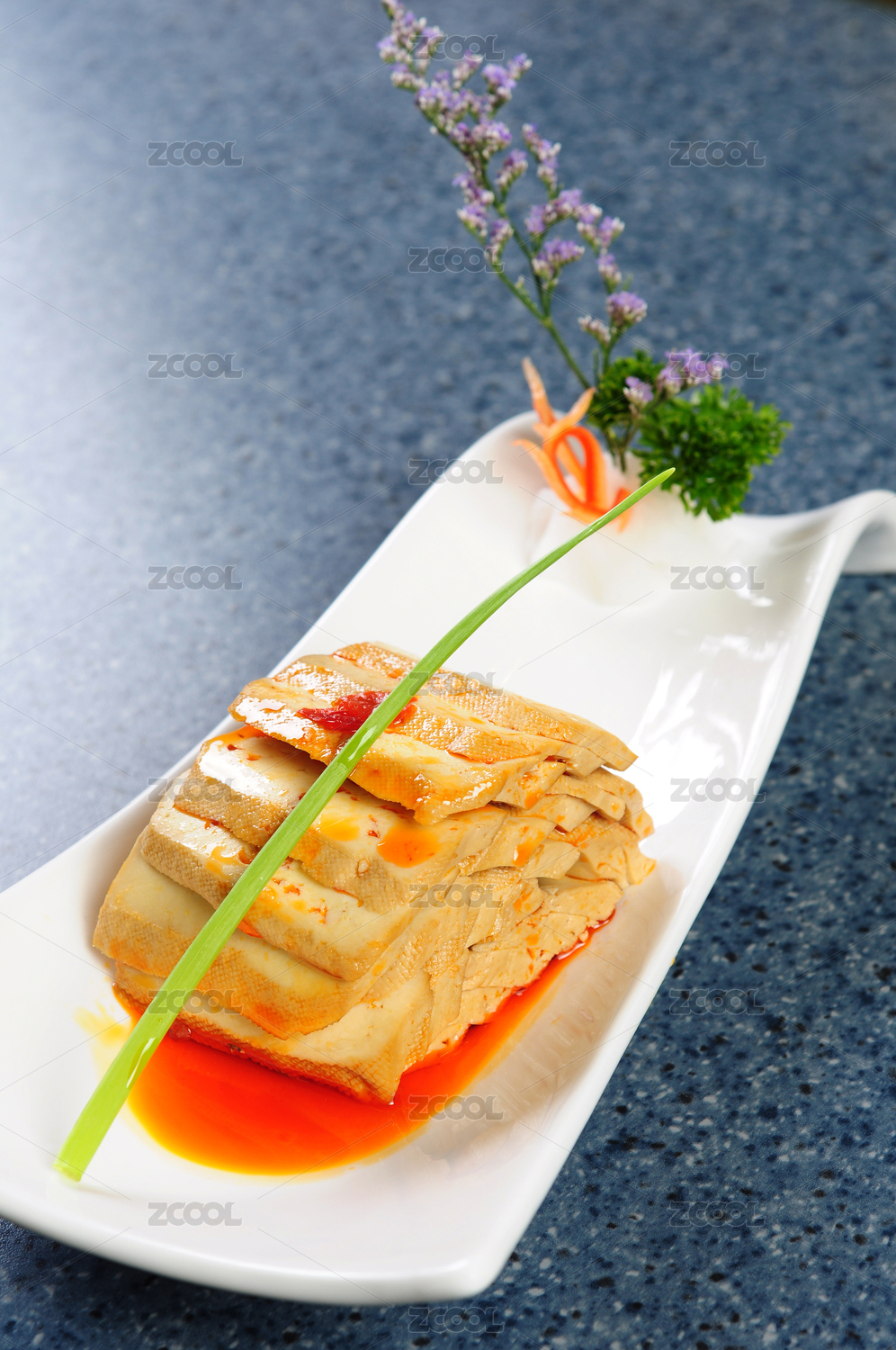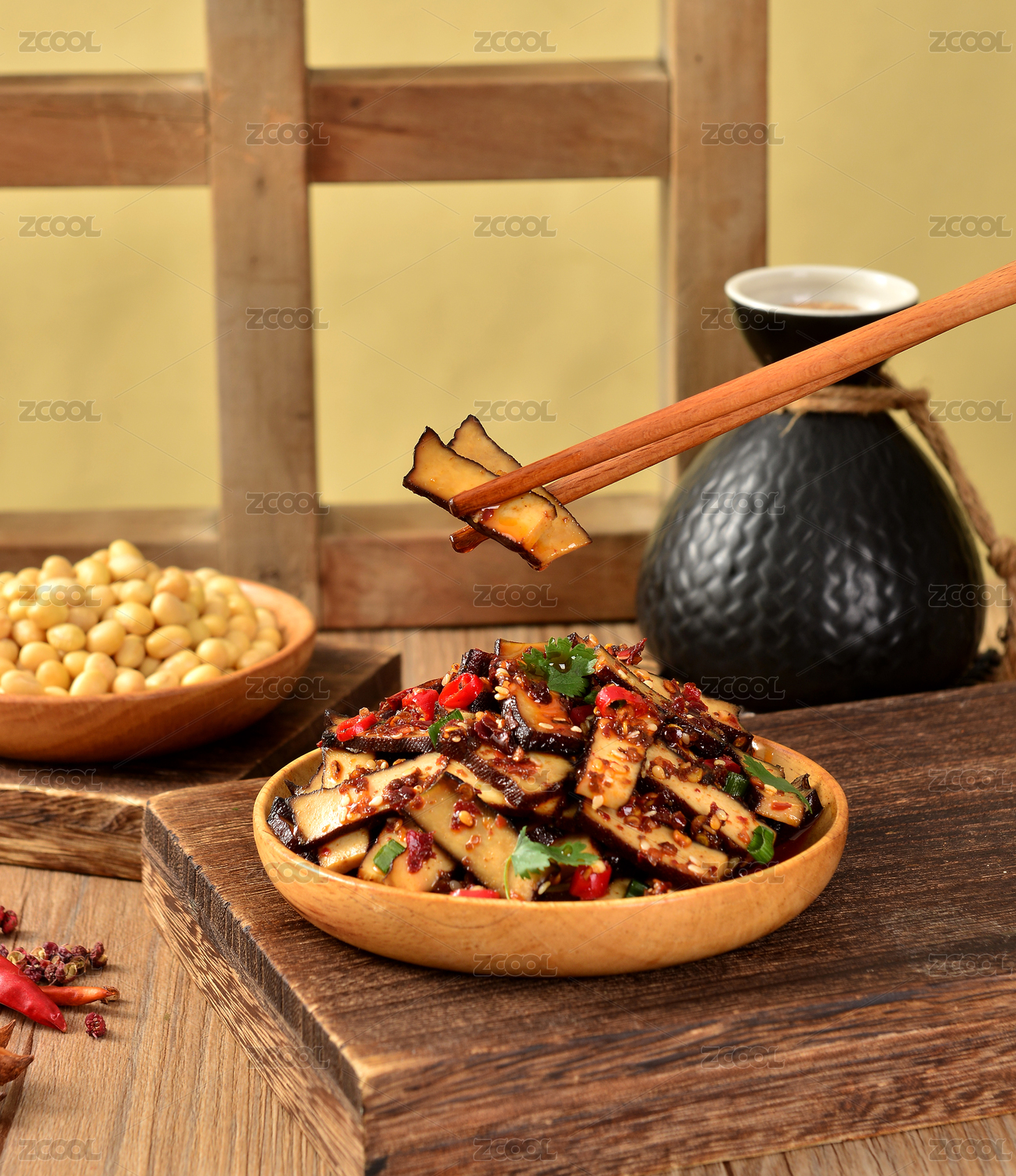 白盘里的凉菜红油辣椒拌笋尖豆干