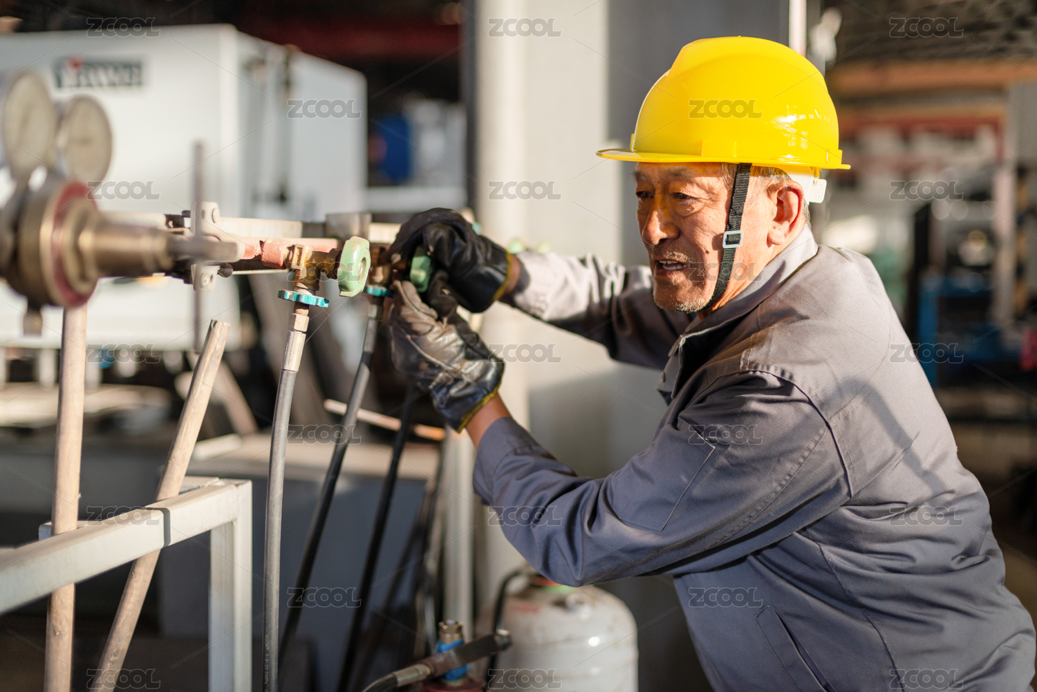 一名戴安全帽调节氧气瓶的技术工人