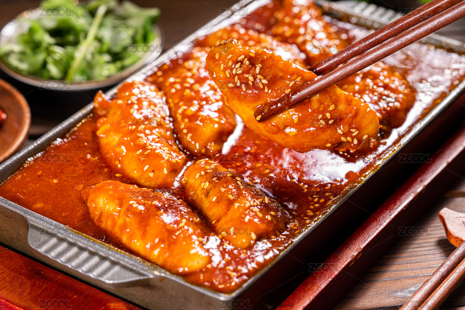 餐盘里的辣焖鸡翅