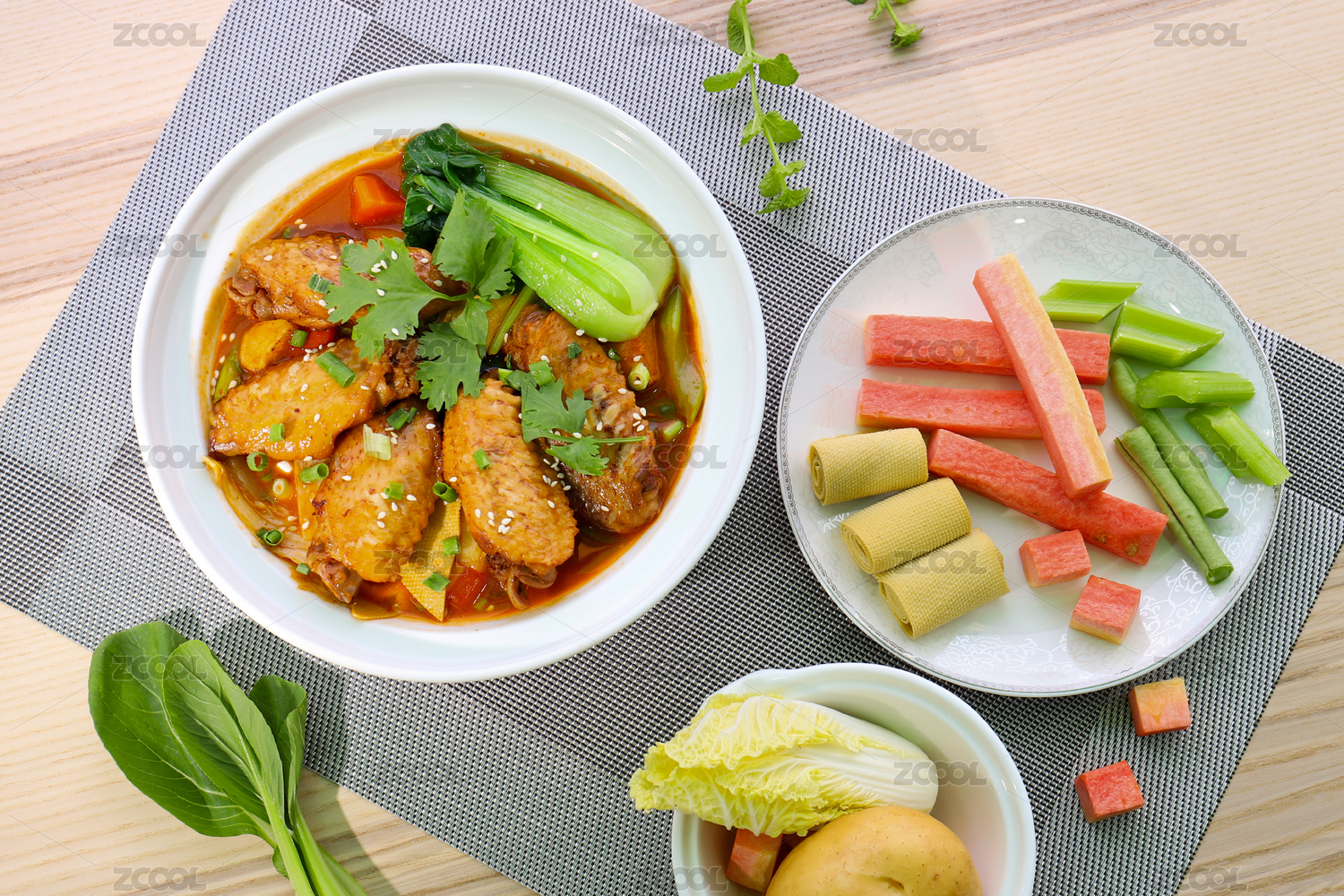 木纹背景上碗里的鸡翅煲砂锅