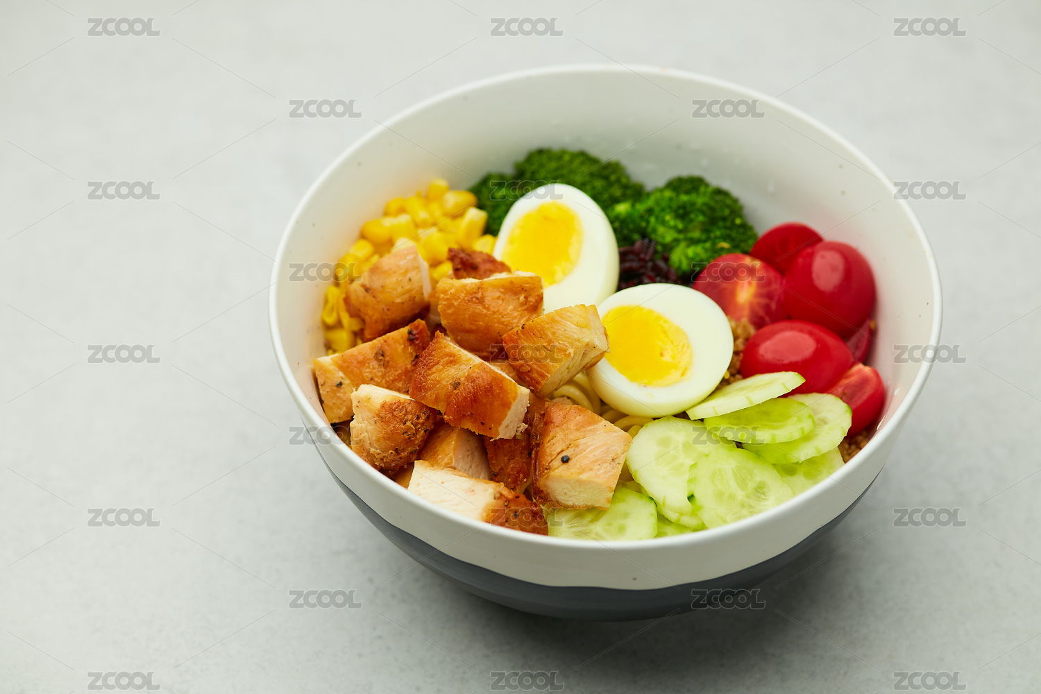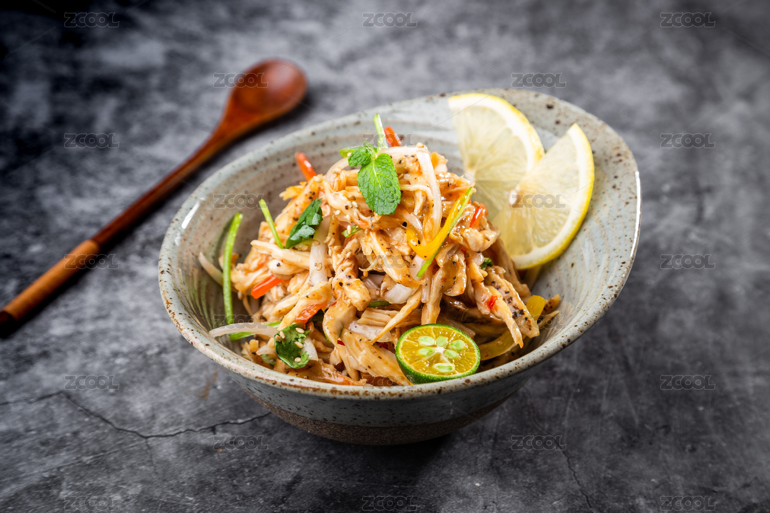 水泥纹桌面上有一碗盐烤黑椒鸡肉沙拉