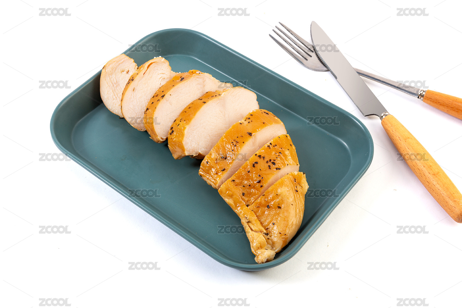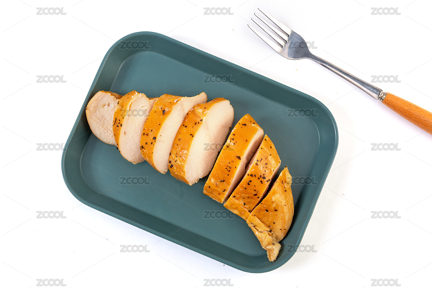 白底上一整块切片的黑椒熏鸡肉