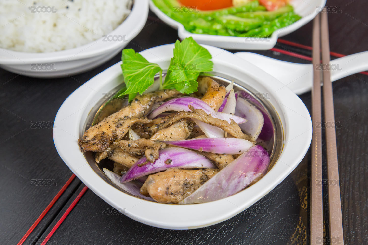 一盘黑椒洋葱炒鸡片特写格子桌布背景