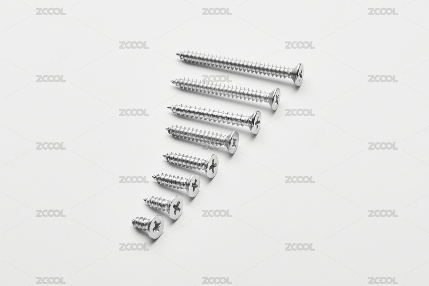 按照长短排列的一排不锈钢螺丝钉
