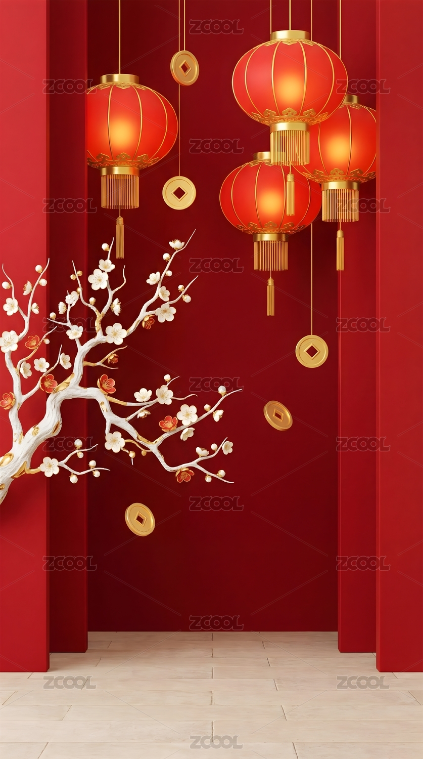 红灯映梅新春喜气盈门