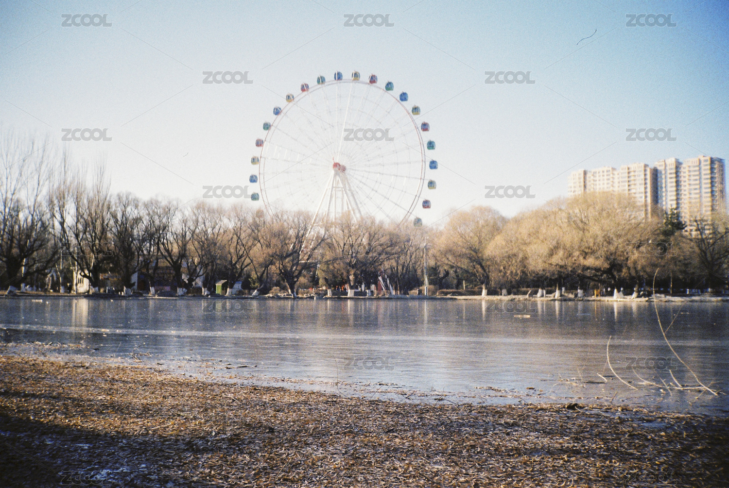 冬天呼和浩特青城公园摩天轮下的湖面结冰