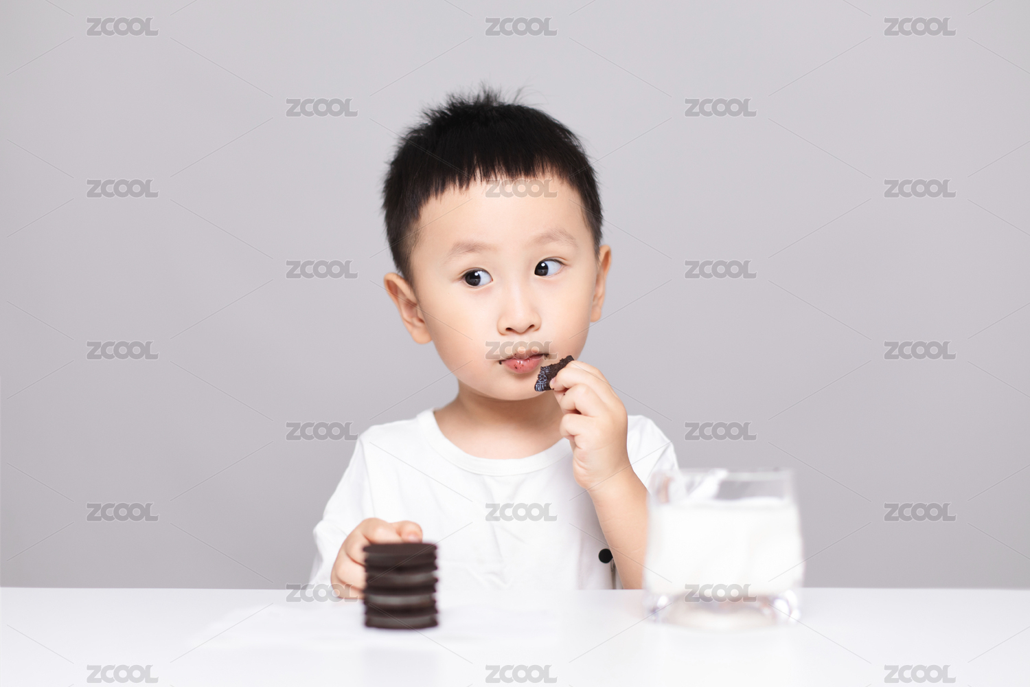 一个可爱的小男孩正在桌子前吃夹心饼干喝牛