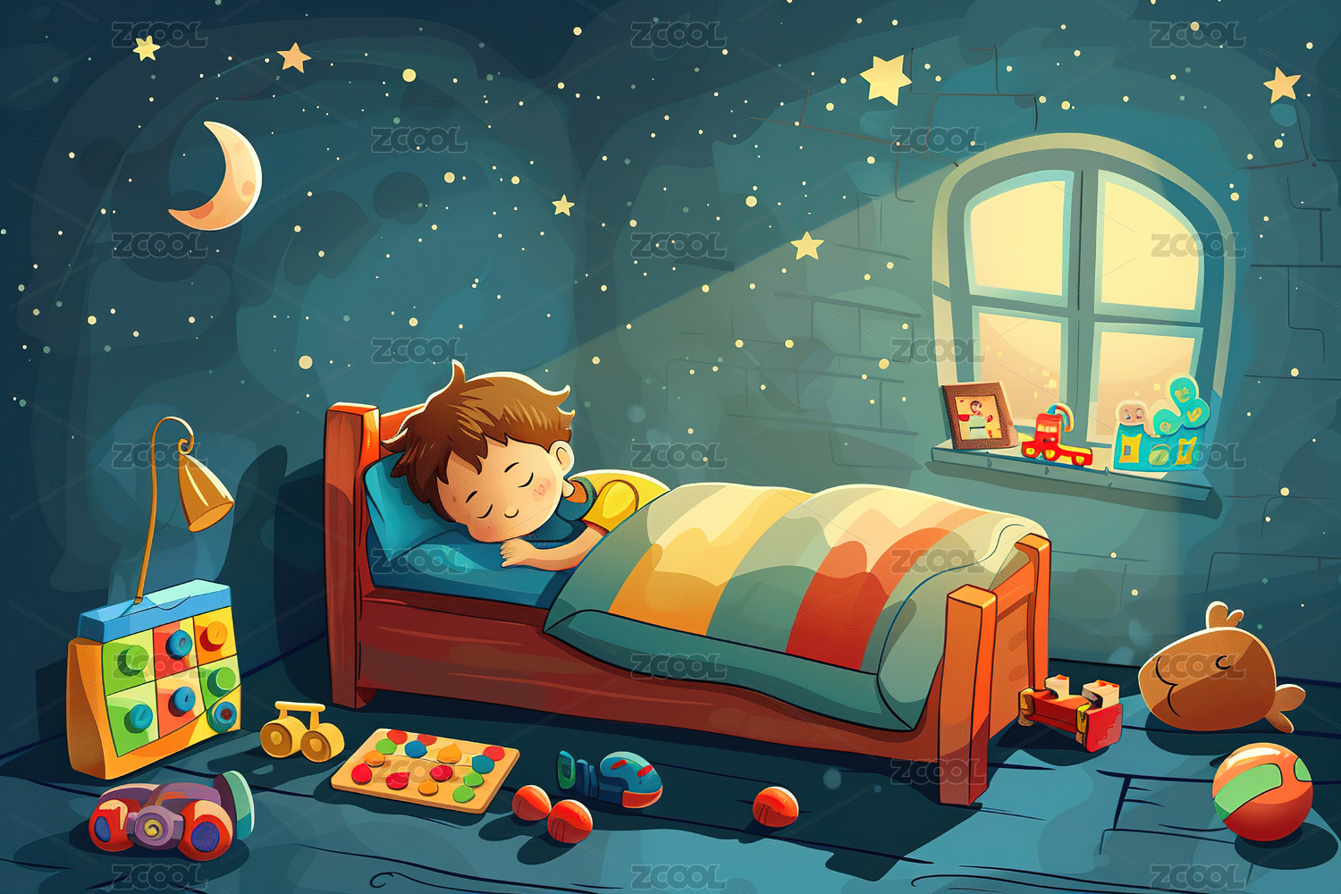 夜晚可爱的小男孩在玩具陪伴下睡觉插画
