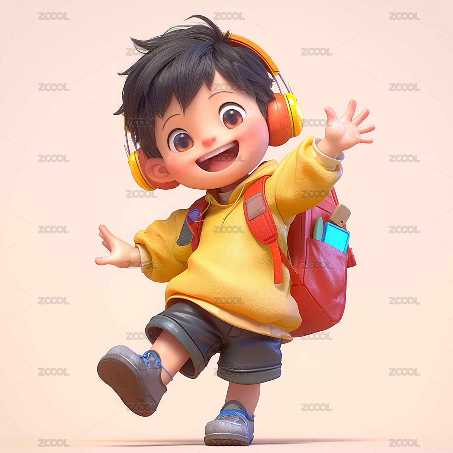 放学戴耳机听音乐开心的小男孩