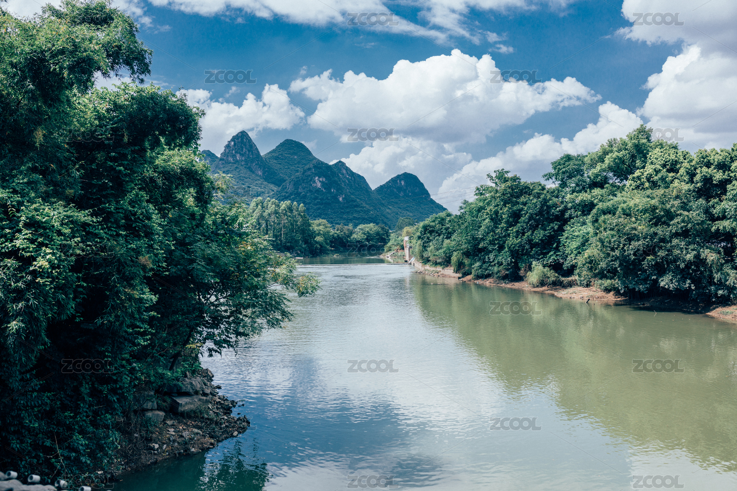秋天阳光下桂林山边桃花江两岸的绿树和红叶