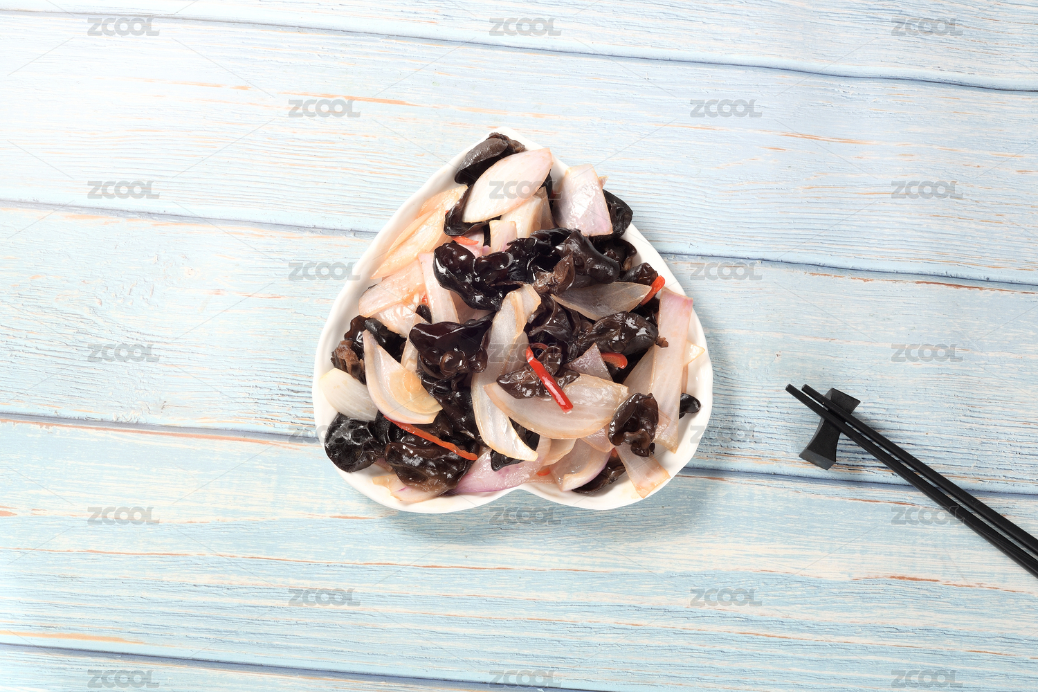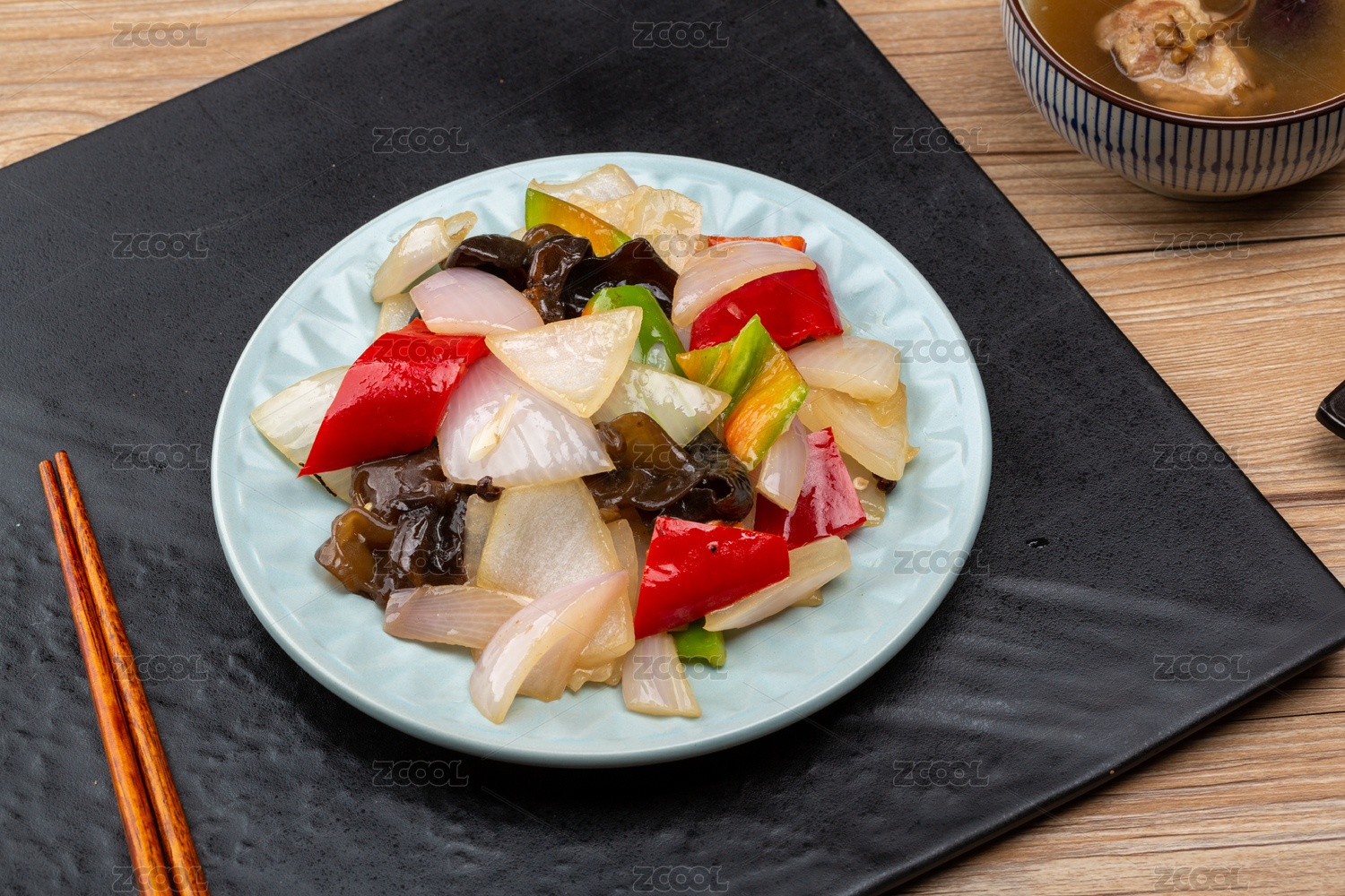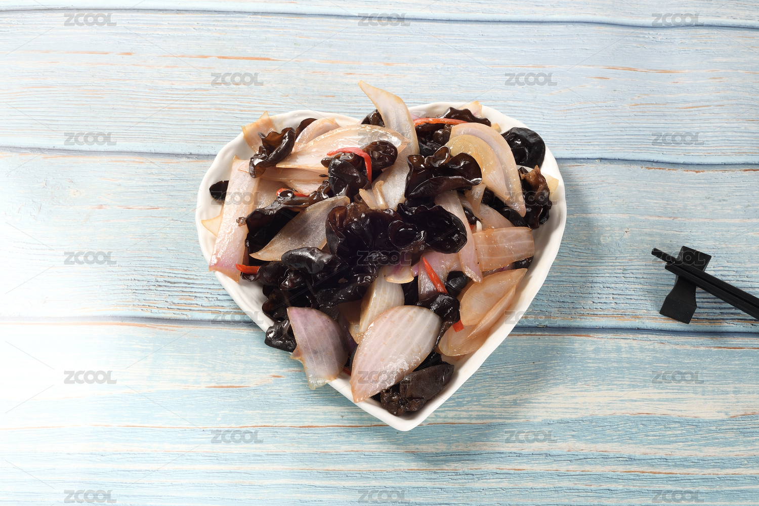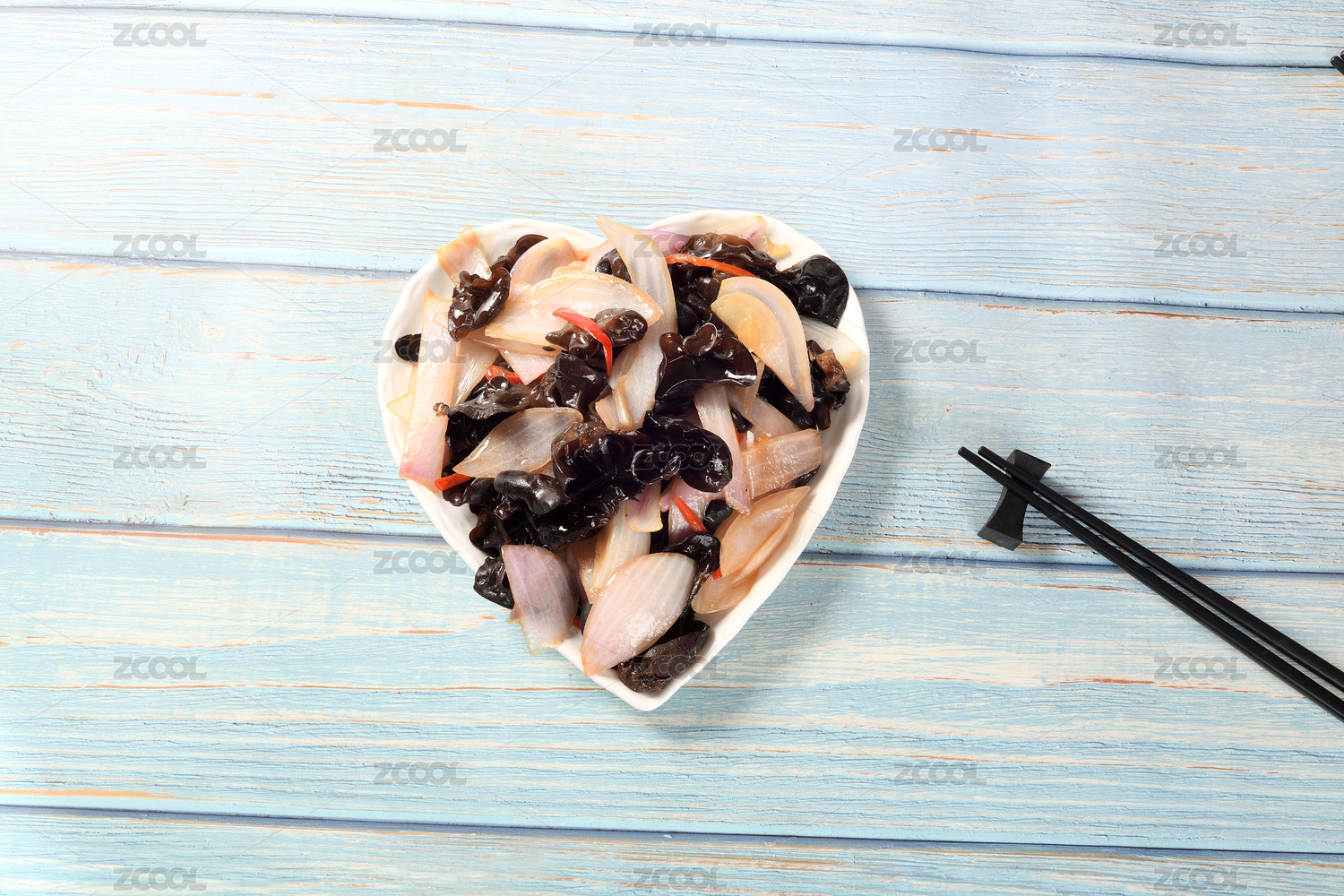 木质底纹上的长瓷盘装的木耳洋葱炒秋葵