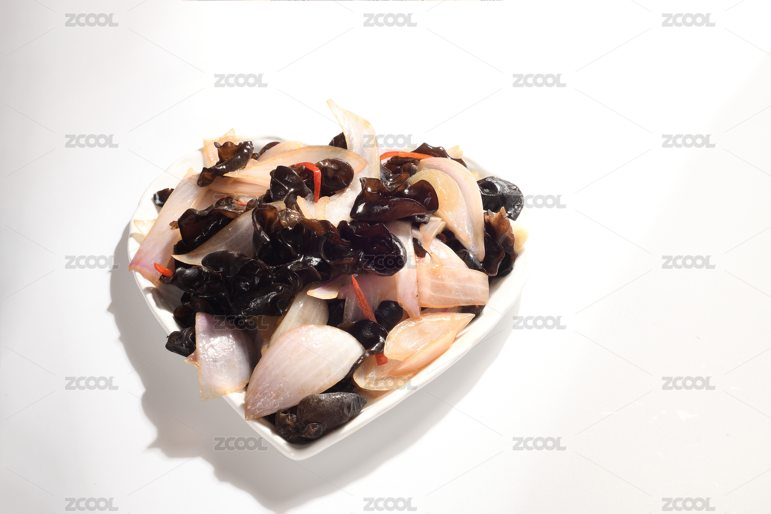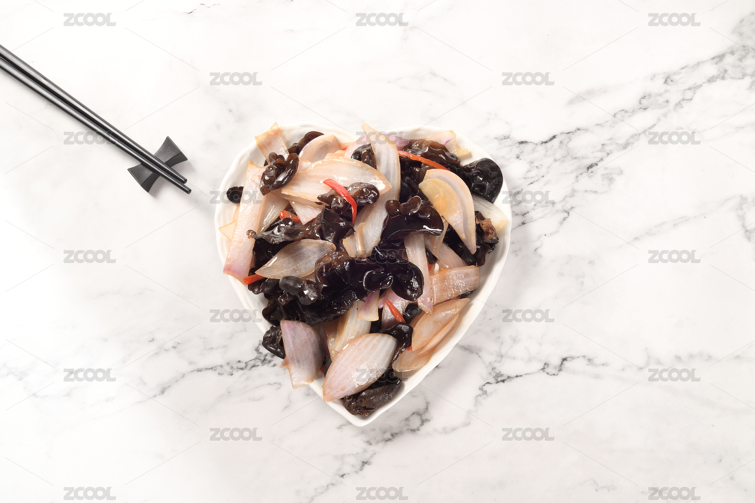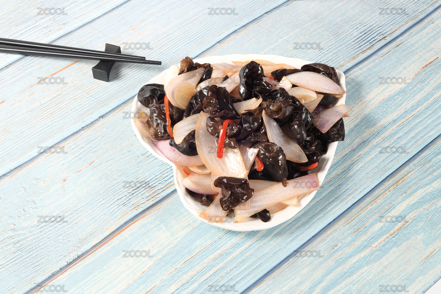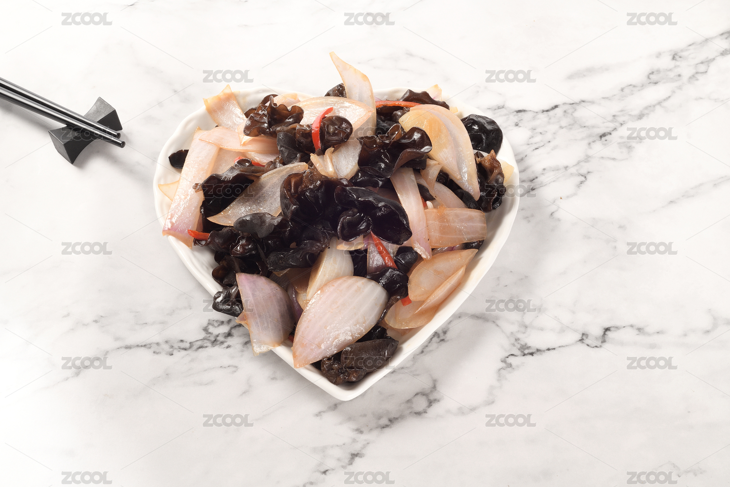 木质底纹上的长瓷盘装的木耳洋葱炒秋葵