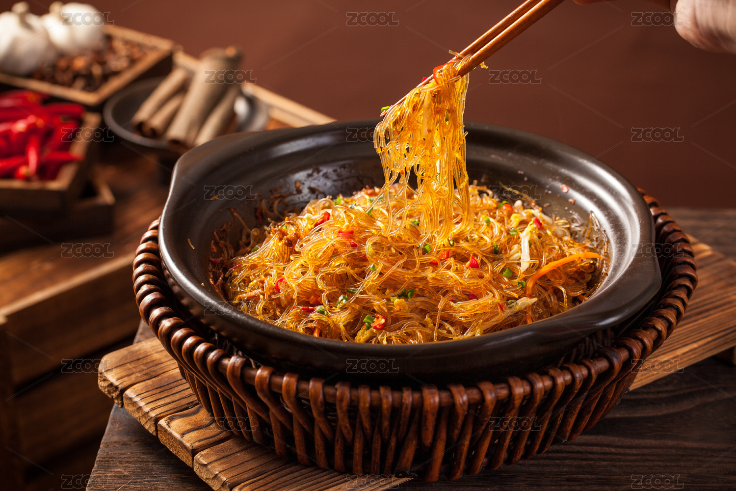 干捞海皇粉丝煲摆放在黑色鹅卵石上