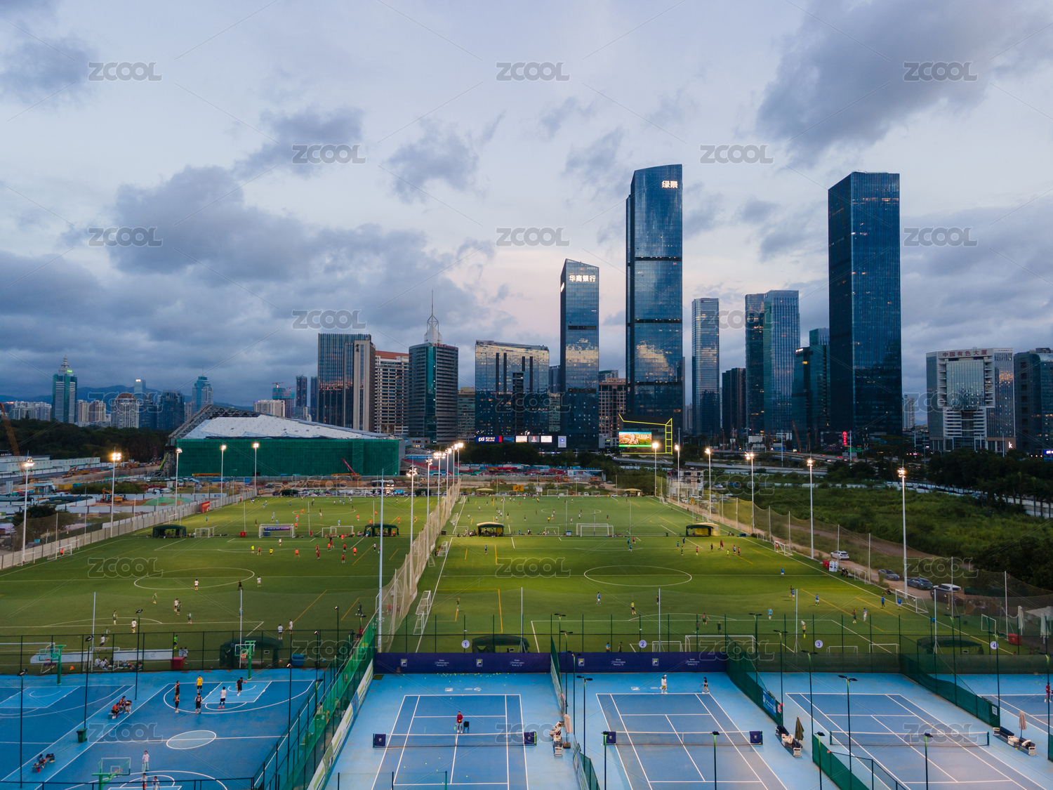 深圳福田区车公庙黄昏下的写字楼与运动场地