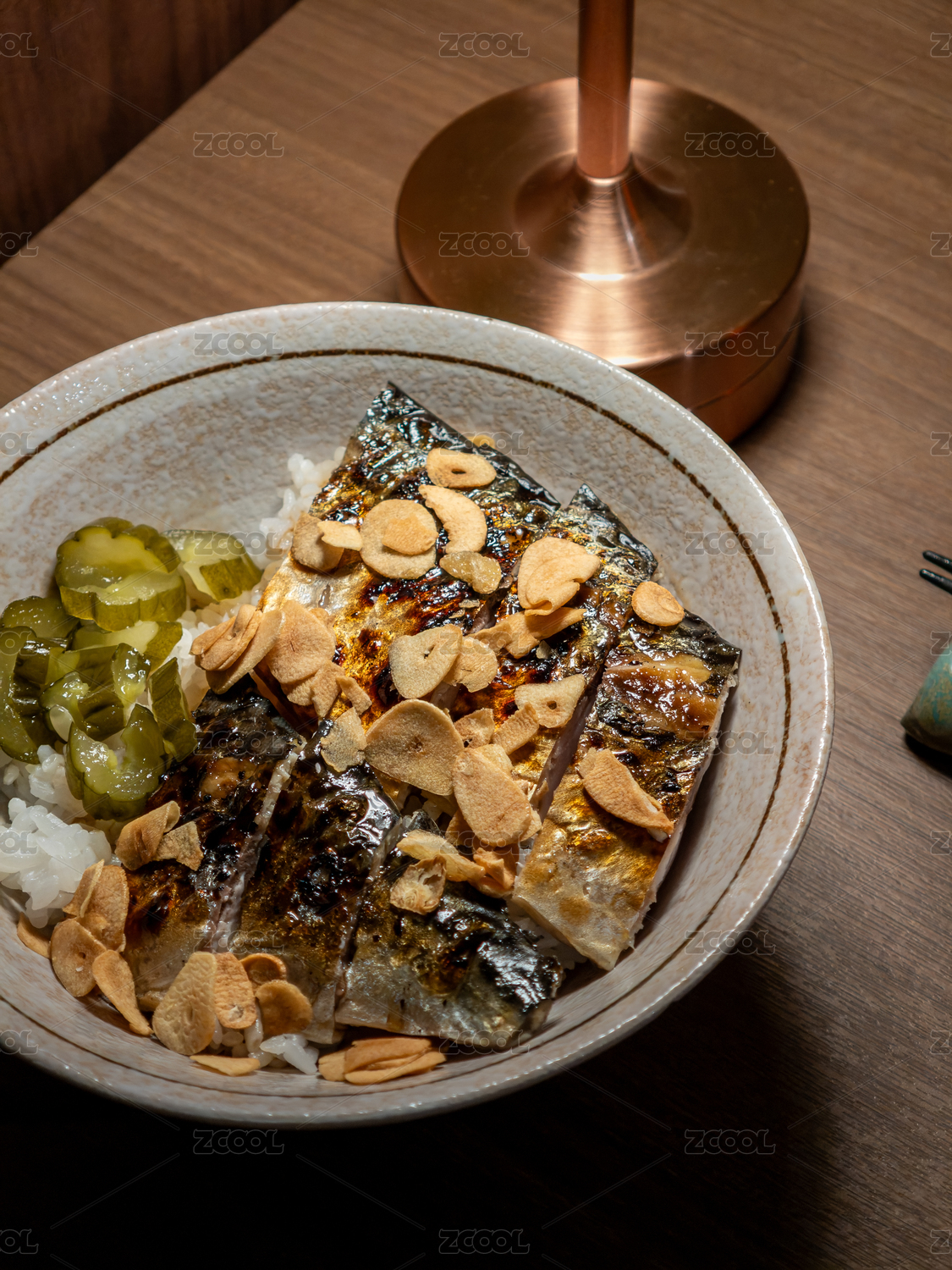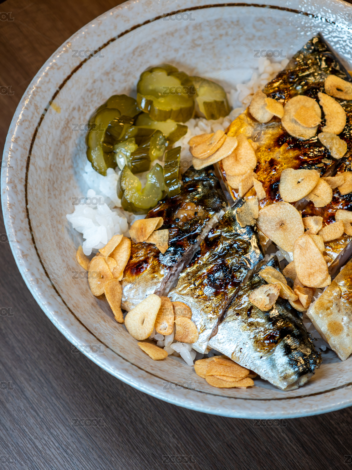 配腌黄瓜和蒜片日式烤鲭鱼饭
