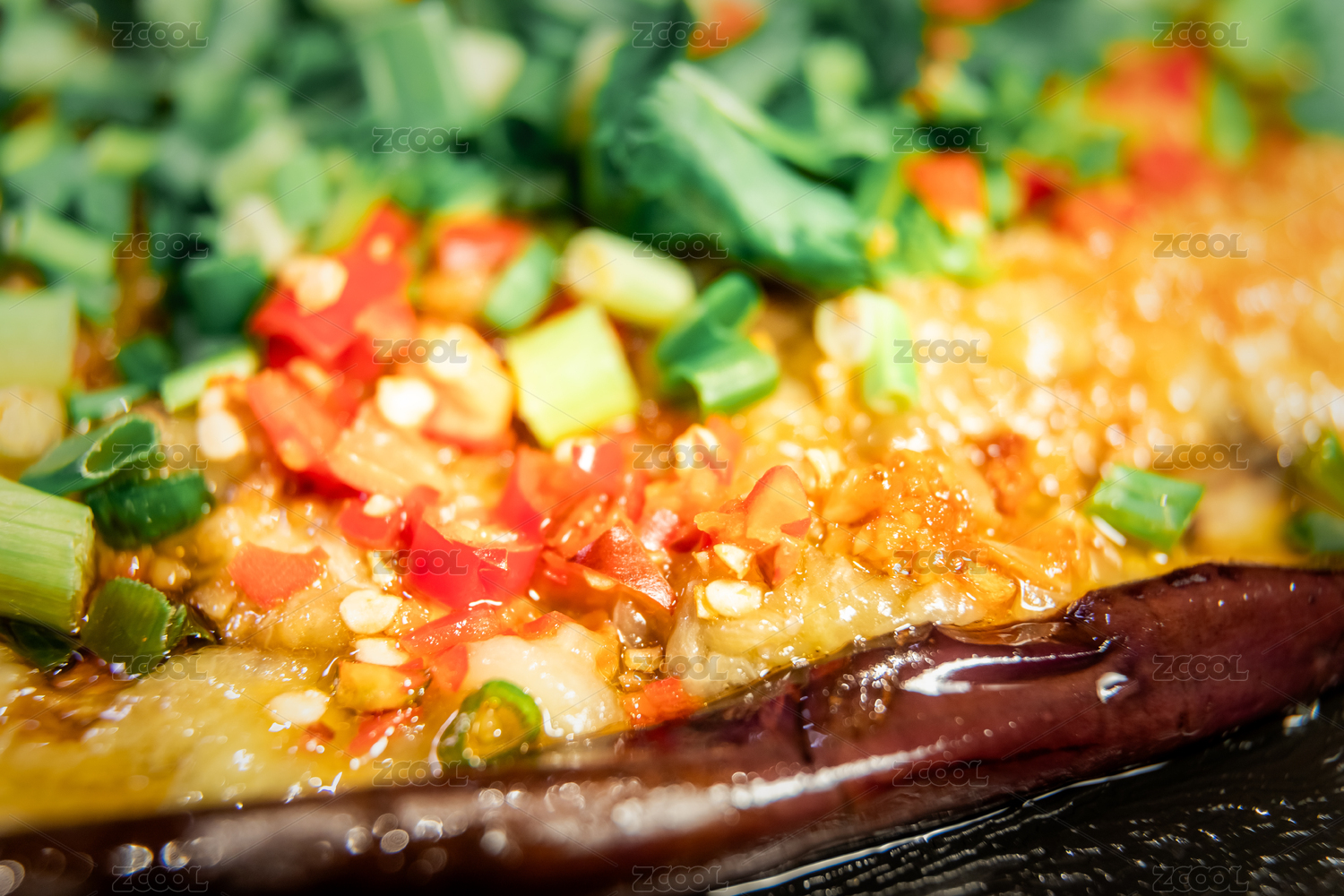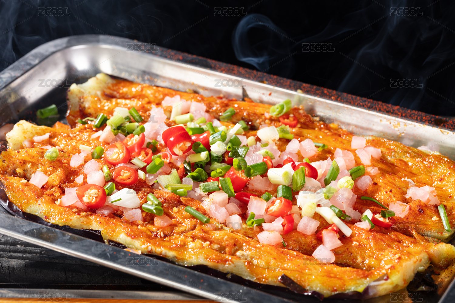 夜市里不锈钢盘装的茄子在炭火烧烤架上烤着