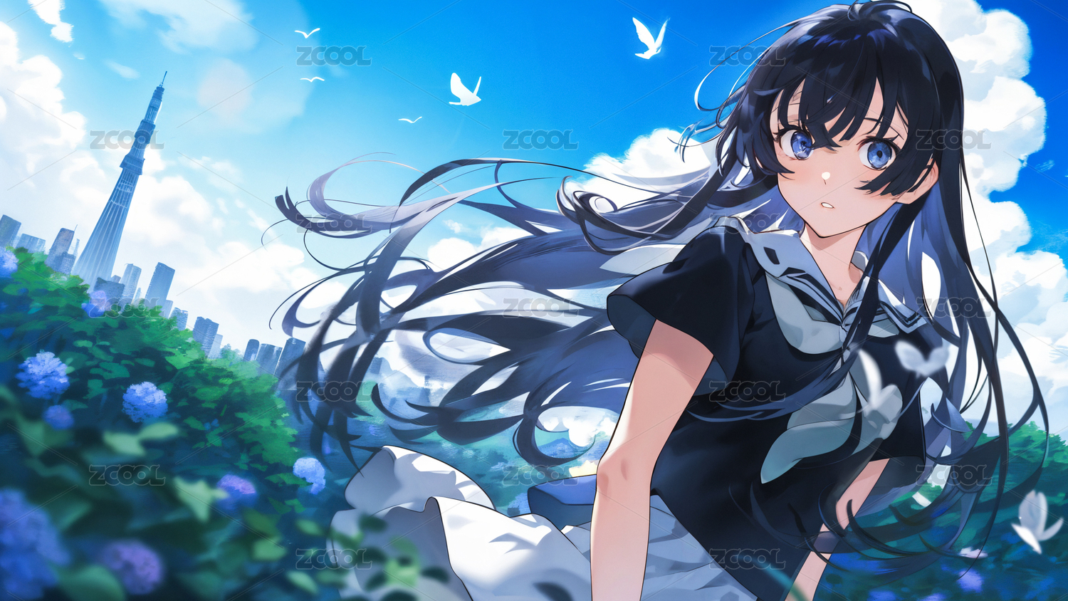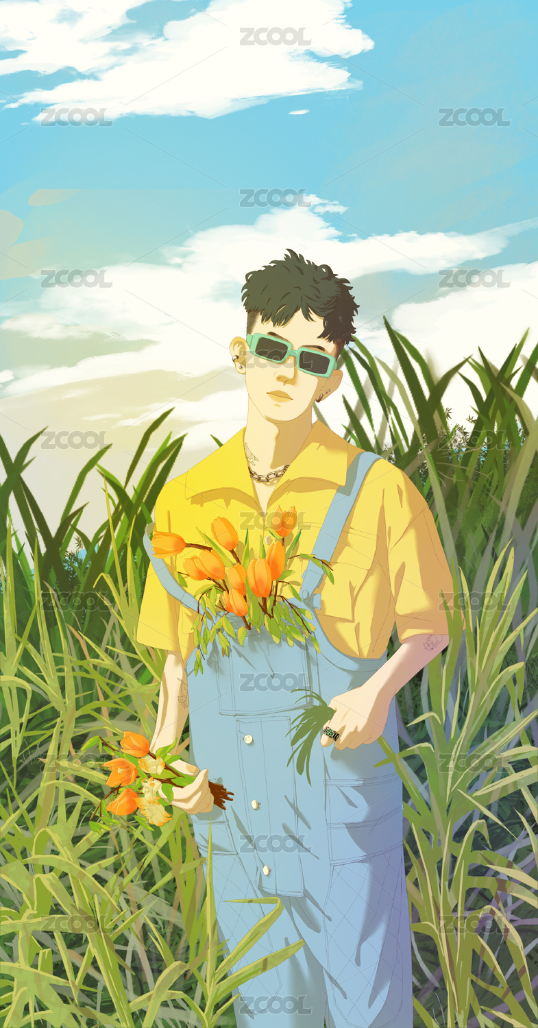 一个健美女性在花草丛间轻盈的跑步做健身运动--扁平化插画