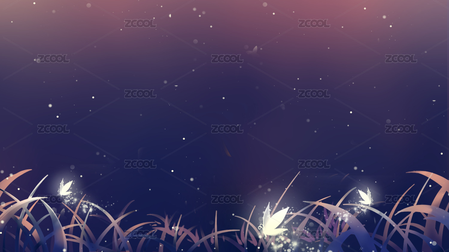 夜晚草丛与荧光蝴蝶卡通梦幻插画背景