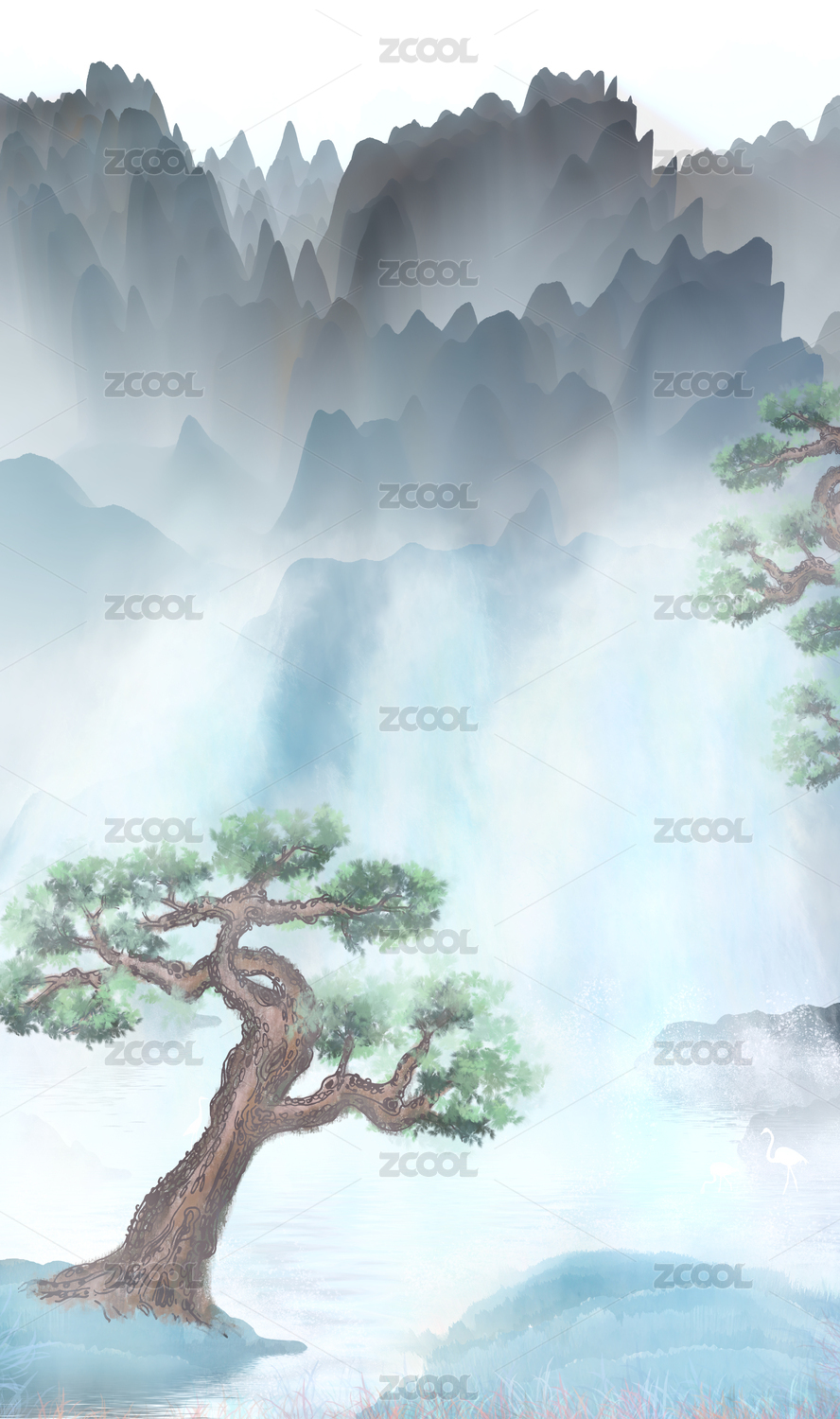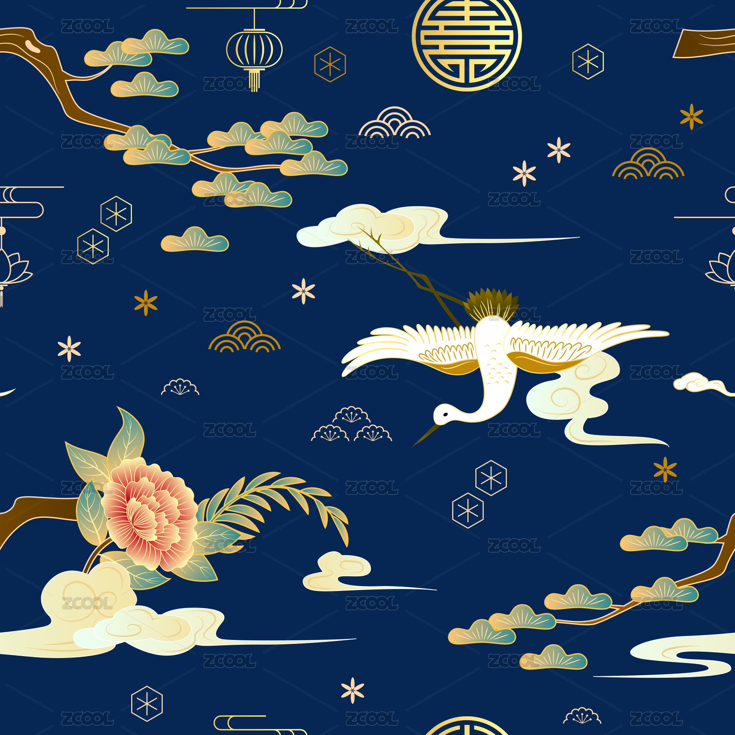 中国风传统仙鹤古松云纹连续平铺背景