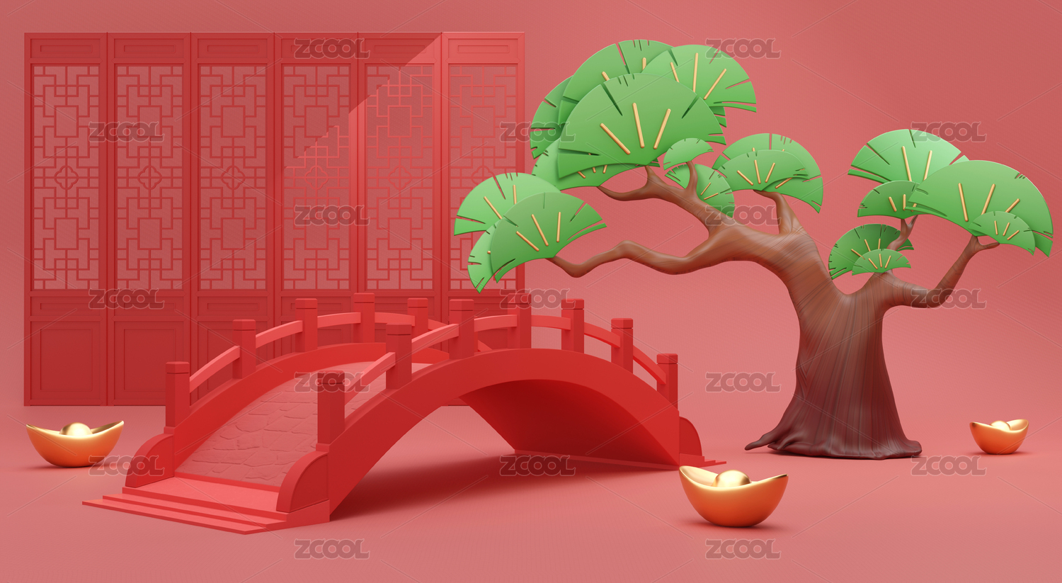 中国传统节日3D古桥和绿色古松组合素材