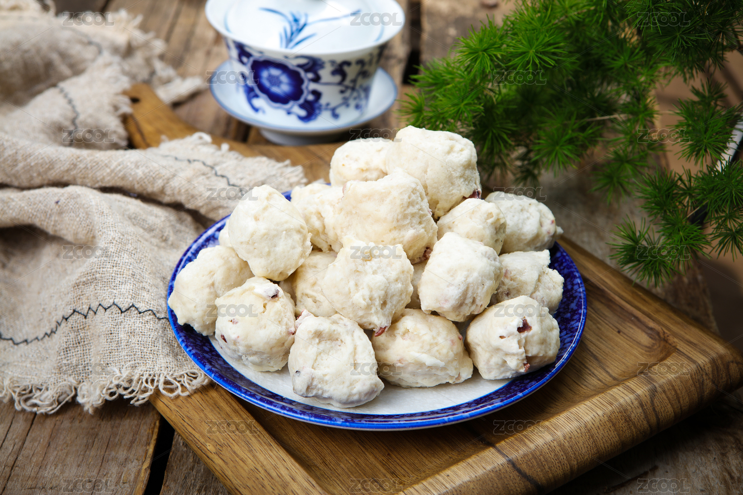 棕色木桌背景下的新鲜鱼丸