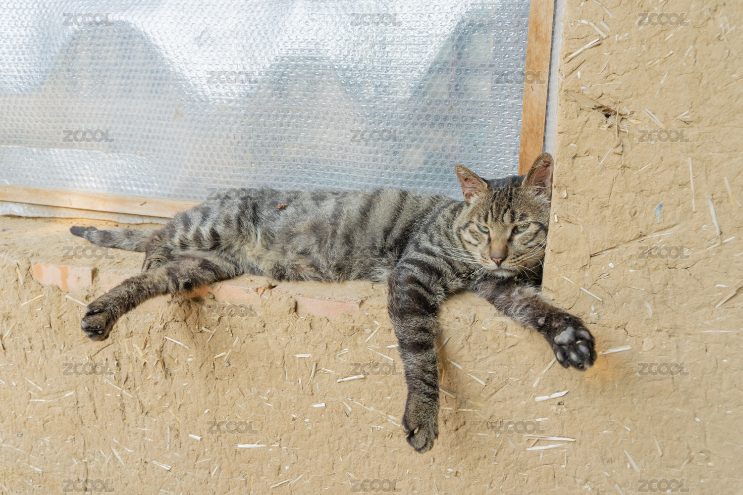 猫躺在窗台上农村院子土墙土房