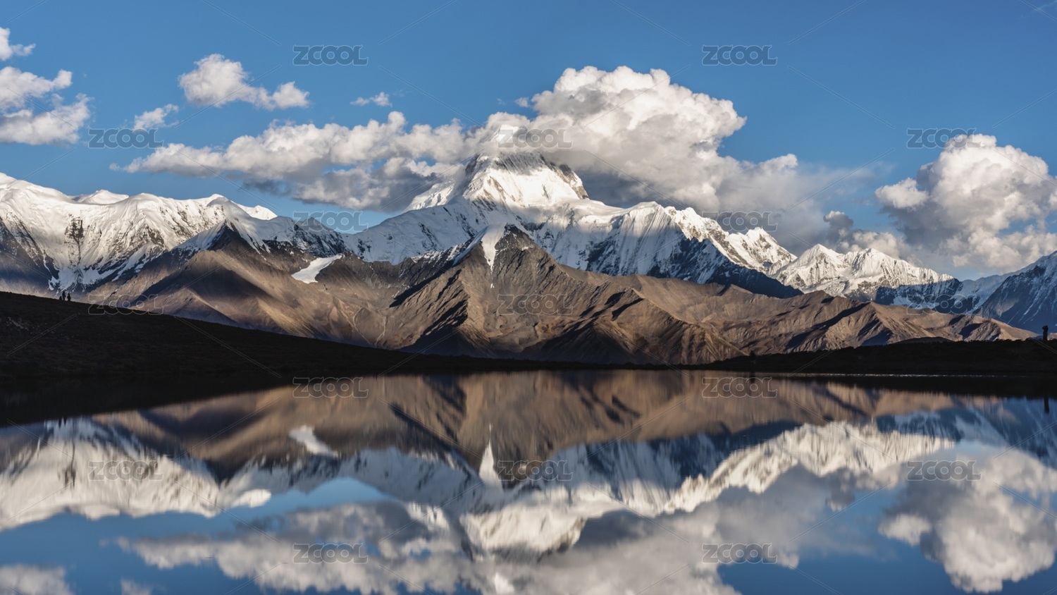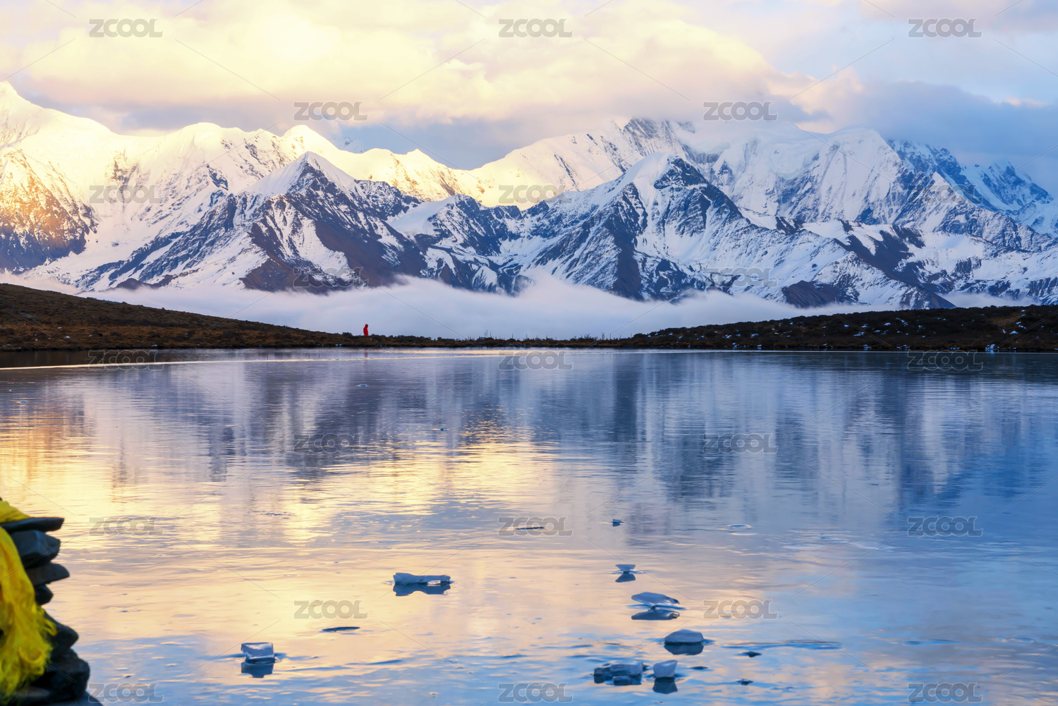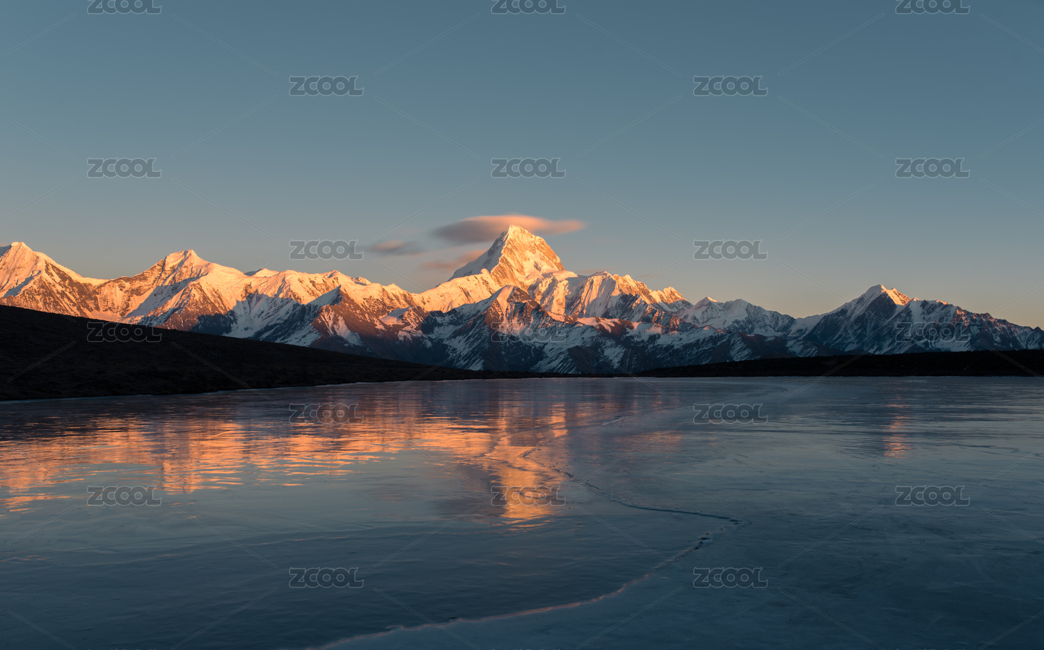 中国四川川西冷噶措眺望贡嘎雪山日照金山