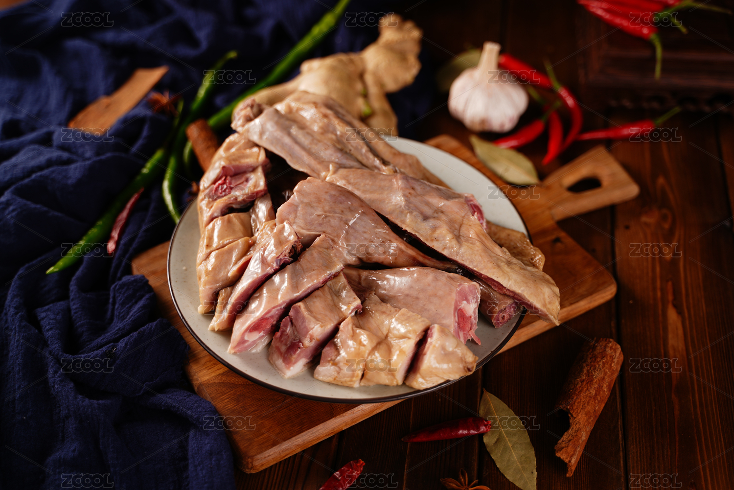木板背景上一盘美味的咸鸭