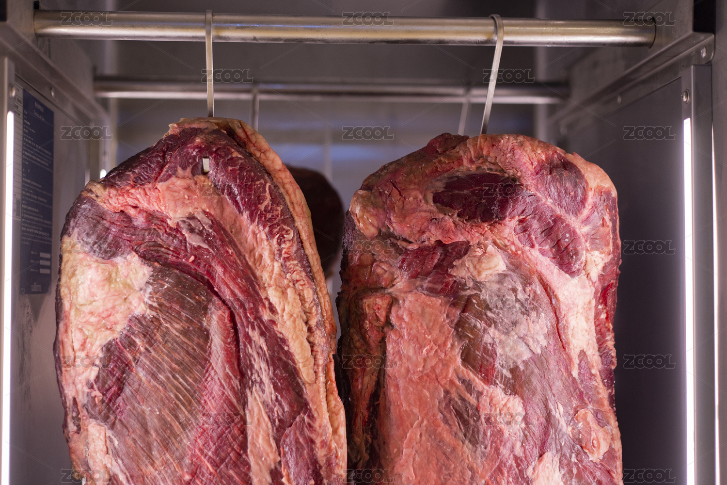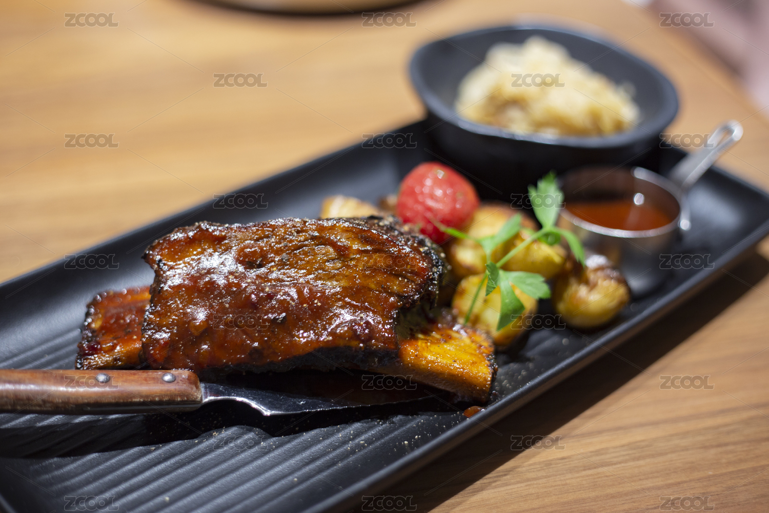 黑色铁盘上的一份干式熟成牛肉配酱料