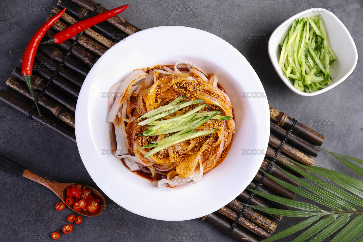 放在深色背景上盘子的香辣凉皮呱呱